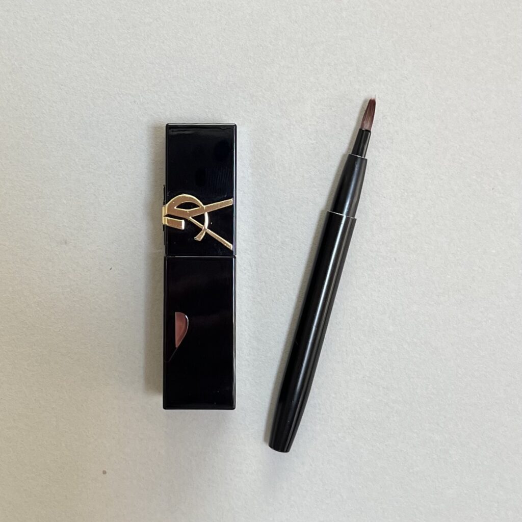 私はリキッドタイプの口紅が好みなのでプチプラコスメでも同系色のものを試しましたが、特に違いを感じたのは、食後の色落ちです。プチプラのものでは唇の内側の色落ちがひと目でわかるのに対し、「YSL ザ インクス ヴィニル クリーム」は色もちがよく、落ち方も自然なためあまり目立ちません。