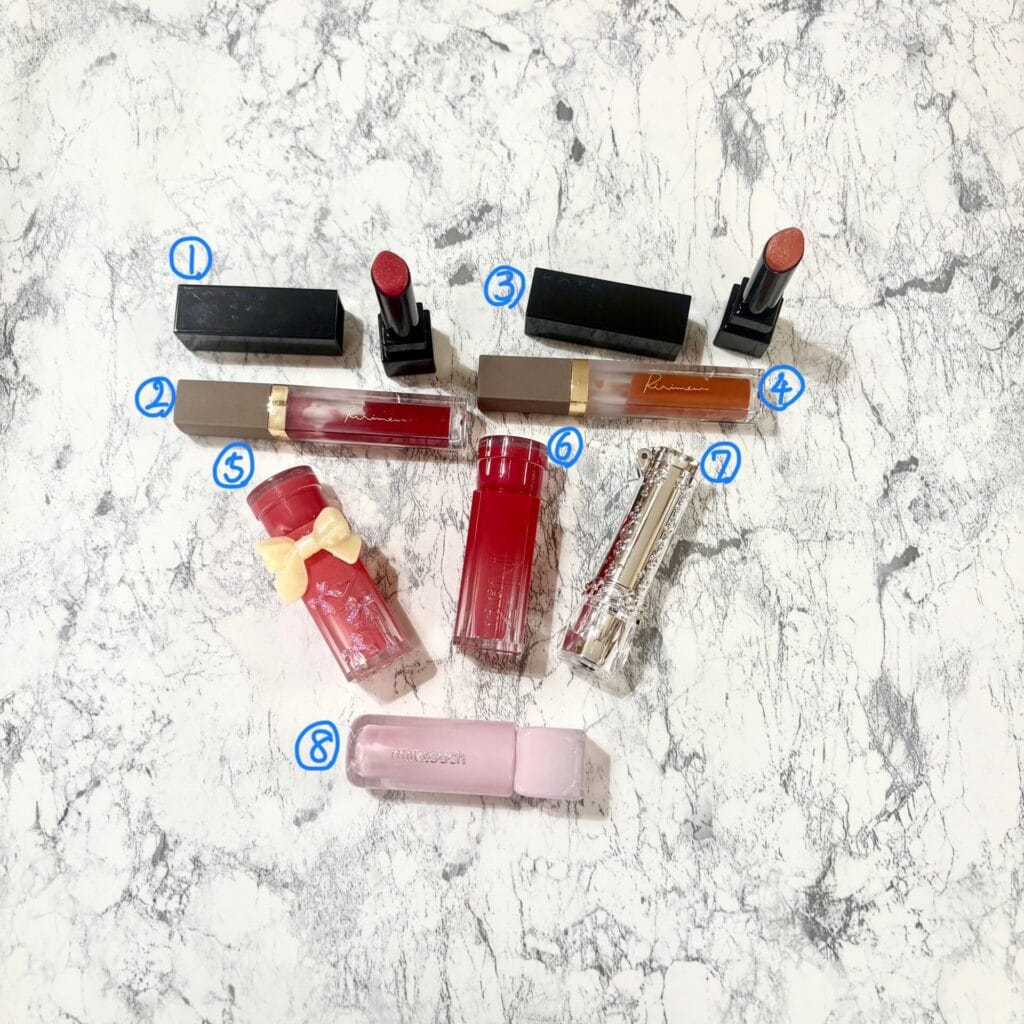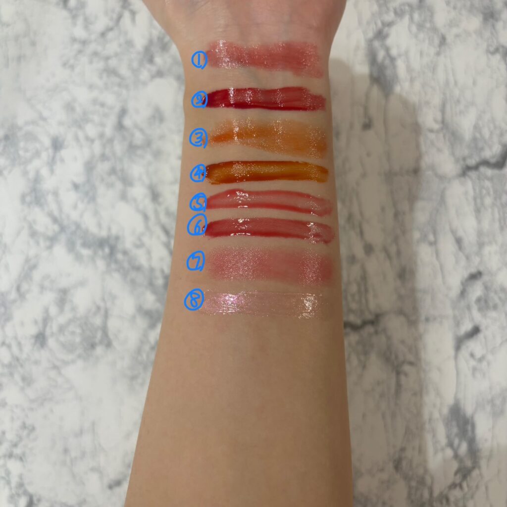 このリップは艶々トゥルトゥルで保湿力が高いのに落ちないです!⑤は色が薄めなので3度塗りくらいして使っています!⑤は可愛らしいコーラルピンクで⑥は大人っぽい赤です!
