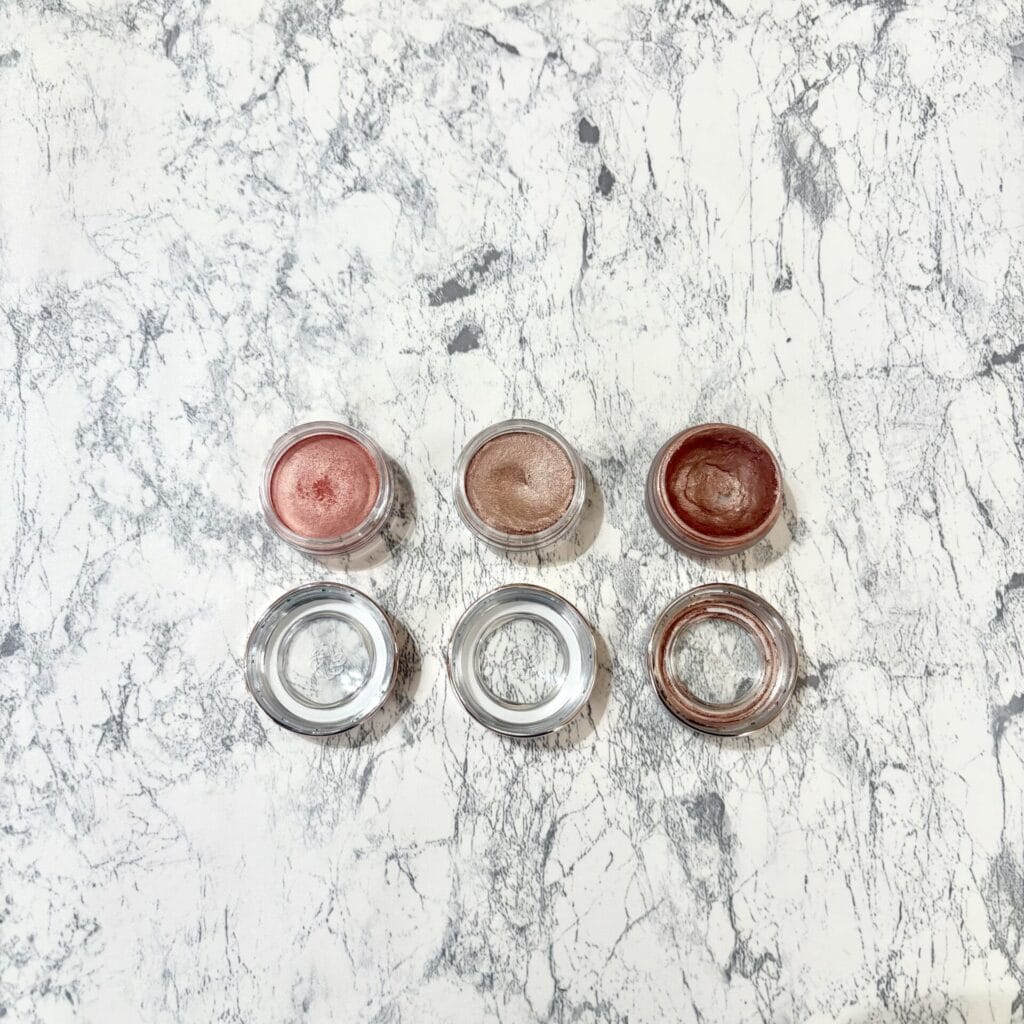 こちらのアイシャドウは指にとって塗布するクリームタイプでとても時短になります!朝はいつもバタバタなので愛用しています。一番初めに購入したのが左写真一番右の13G apricot teaでこちらは田中みな実さんが愛用しているとバズっていた商品です。一色でサッと仕上げられるのに上品な輝きでこなれた印象になります。もう少し薄い色が欲しくなり購入したのが左写真真ん中の12G satin shineです。本当にサテンのような輝きでどんなリップやチークとも相性がよく、いつも迷った時には手が伸びています。どのような色とも合わせやすいのでおすすめです!6月の値上げ前に駆け込みで購入したのが05G peach bloomで、イエベ春にピッタリのコーラルピンクで可愛らしい印象に仕上がります。