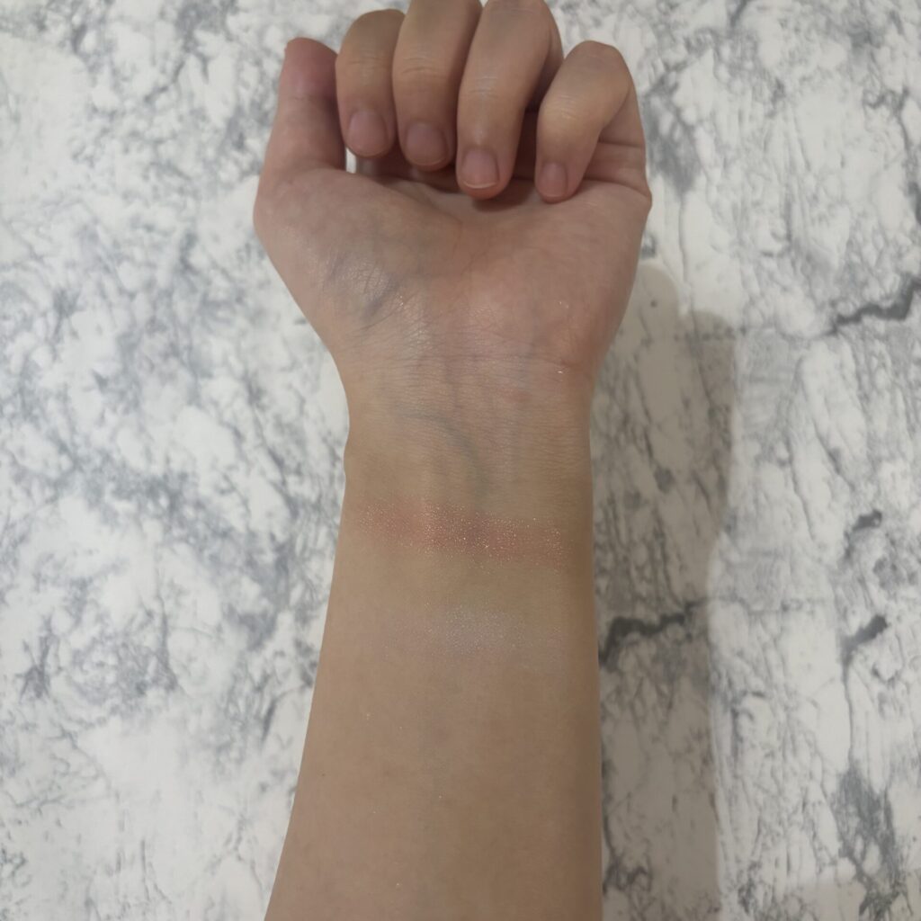 右の写真がスウォッチです!上から05G peach bloom/12G satin shine/13G apricot tea/アイシャドウベースです!こちらのアイシャドウベースは白い柔らかい粘土のようなテクスチャーで伸ばすと透明になります。アイシャドウの密着力が高くなり、発色もよくなるので毎日のメイクに欠かせません!アイシャドウベースを使っていない方ぜひ使ってみて下さい!