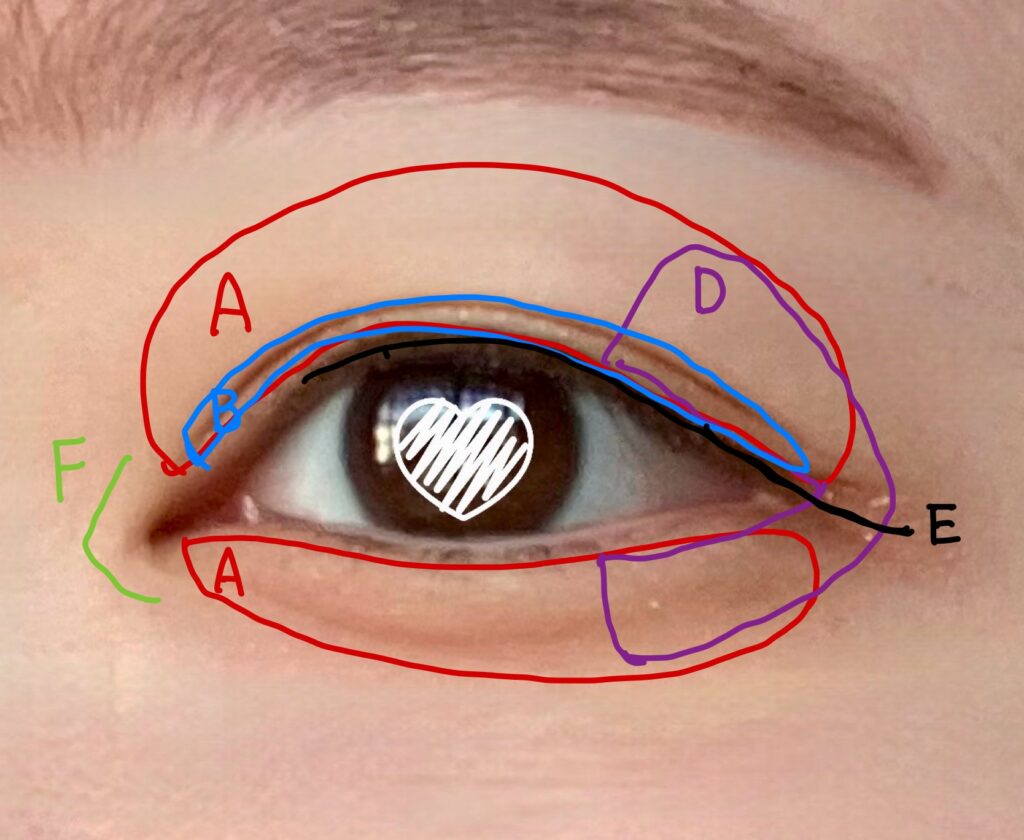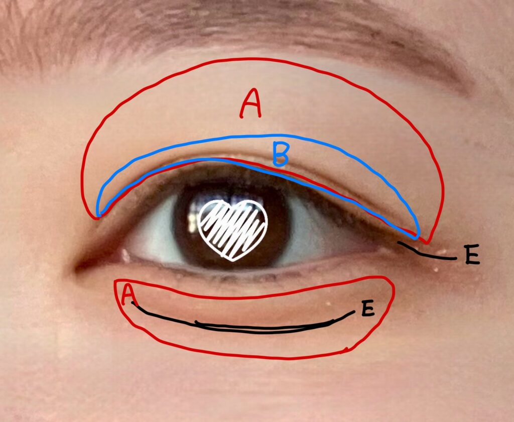 ⑴Aの色をアイホールと涙袋全体に塗る。