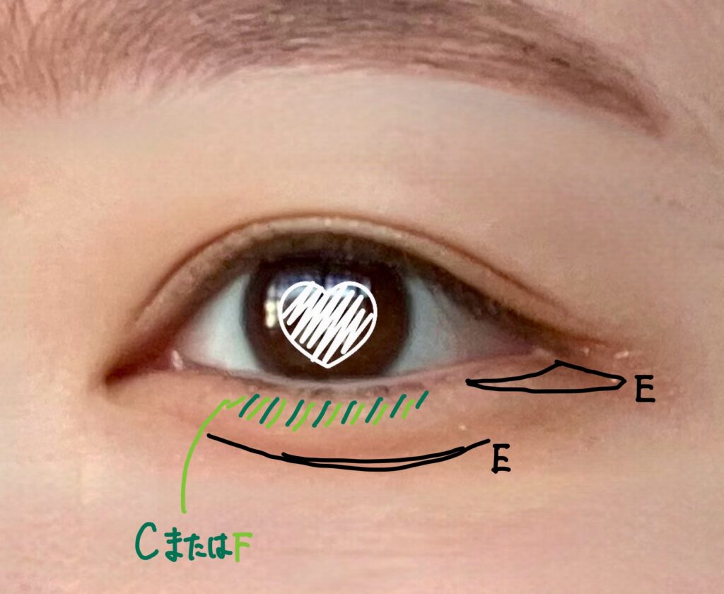 ⑶FまたはCをとり、黒目の下を中心に涙袋の上部分にのせる。