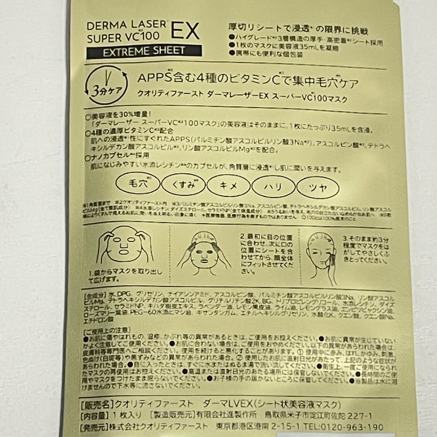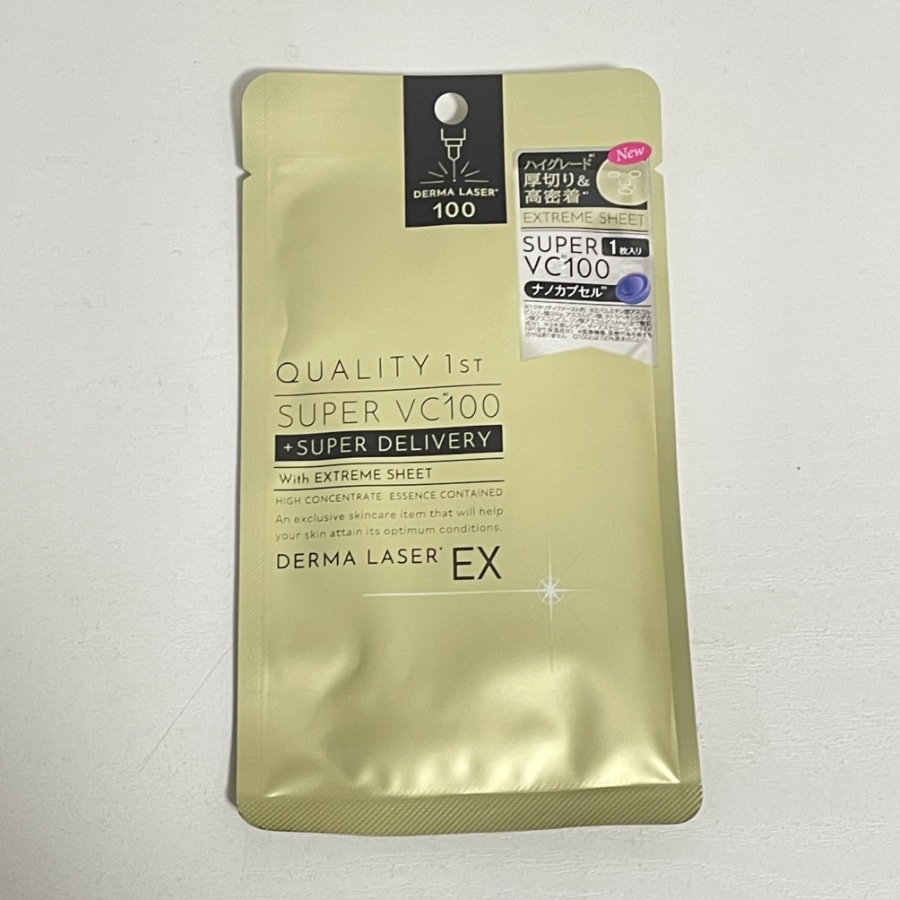 今回使用した「ダーマレーザー EX スーパー VC100 マスク」は、「スーパー VC100 マスク」の美容成分・浸透技術はそのままに、厚みと密着力に優れた「エクストリームシート」を採用。