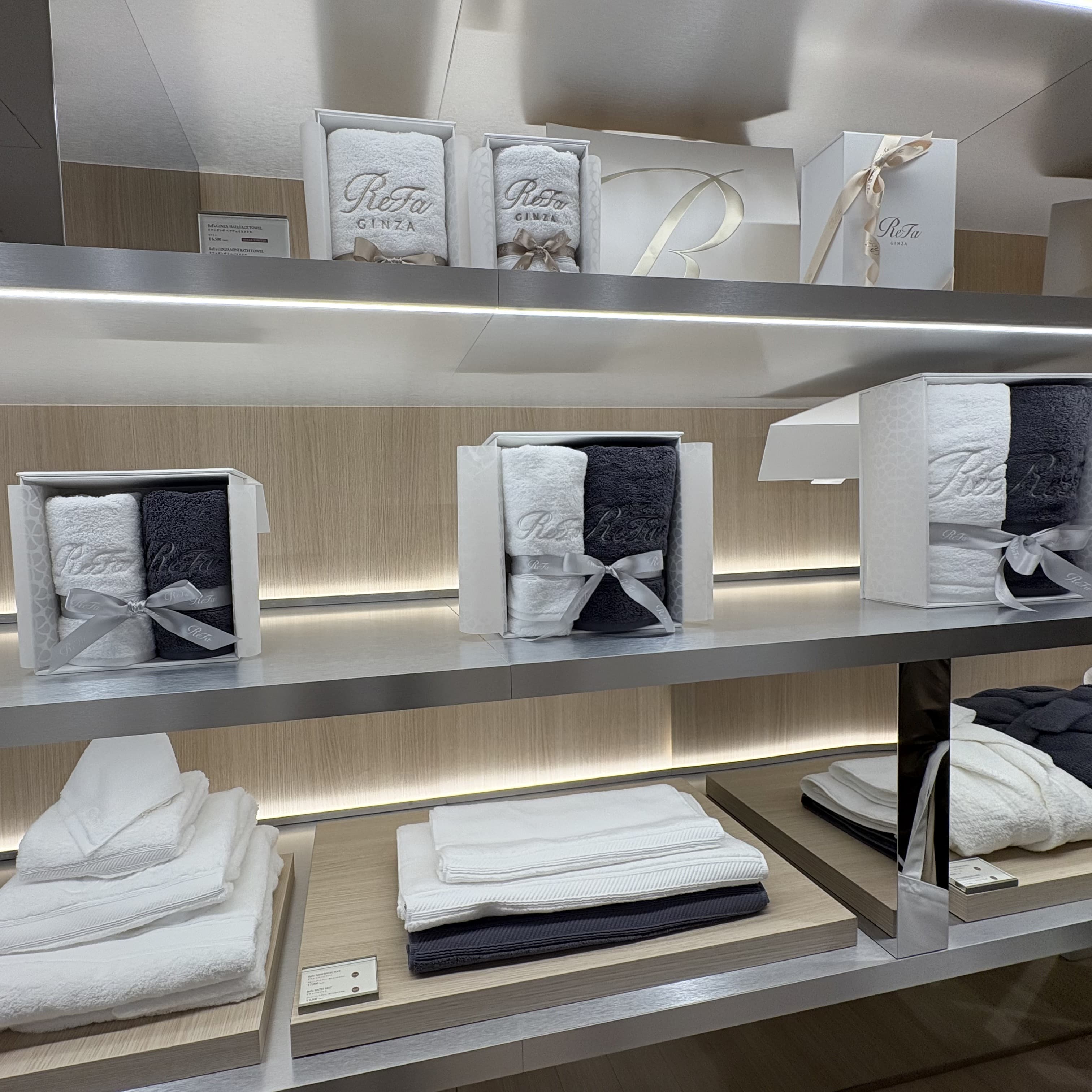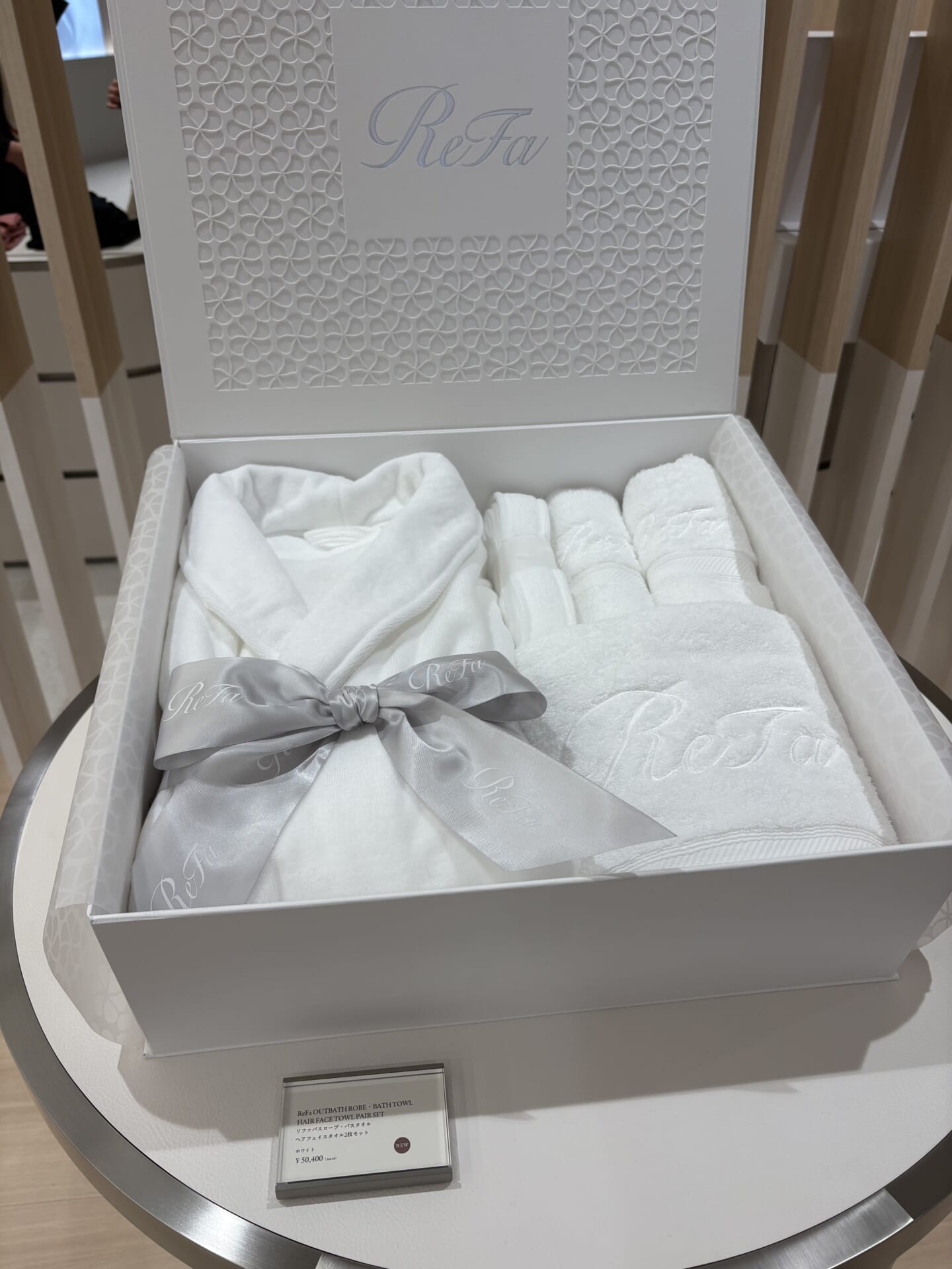 「ReFa LINEN」では、タオルやバスマット、バスローブ、スリッパなどが展開されています。エジプト超長綿が使われており、とても肌触りが良くふわふわでした。