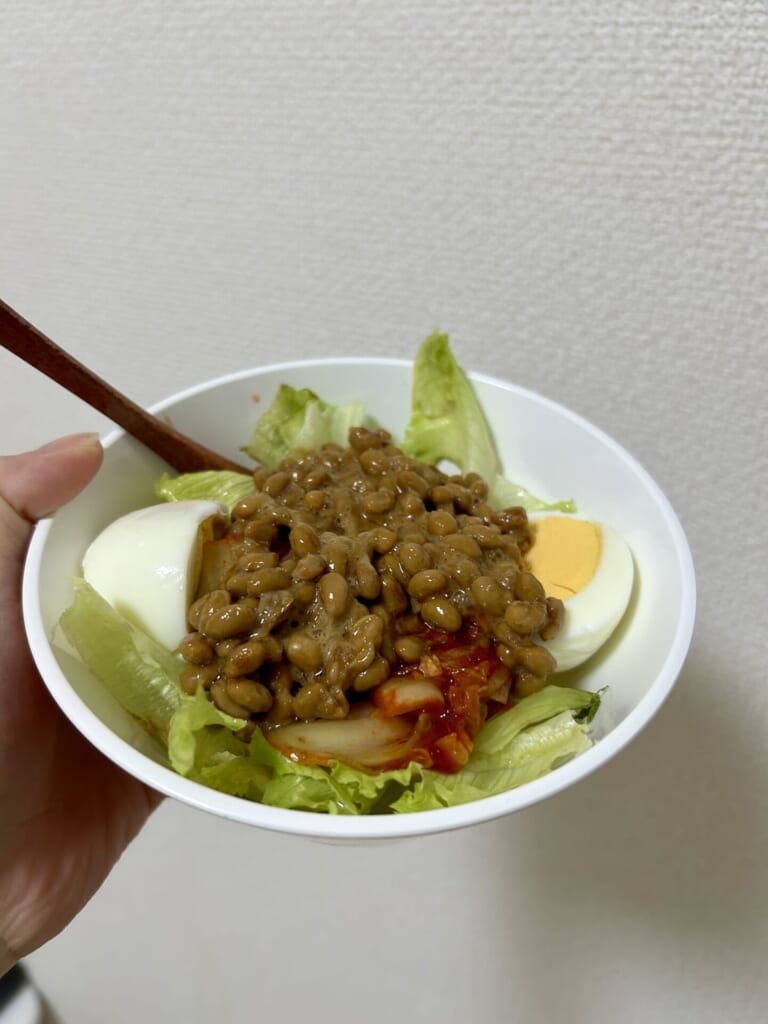 これは豆腐、キムチ、納豆、ゆで卵、レタスに青じそドレッシングをかけた一品。むくみ解消におすすめのレシピです👩🏻🍳