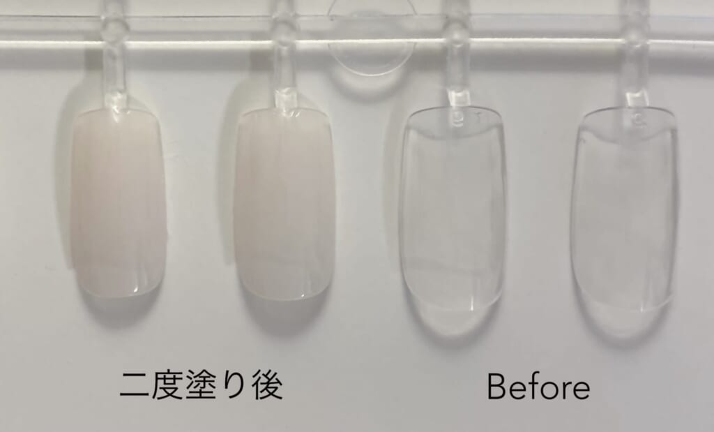 硬めのハケと伸びの良いポリッシュの質感で、一回でムラなく仕上げることができます。塗り直しが少ないことで乾きも早く、短時間で終えられます。二度塗りすると自爪の色が完全に隠れ、「バレリーナ」本来の色になるためおすすめです。