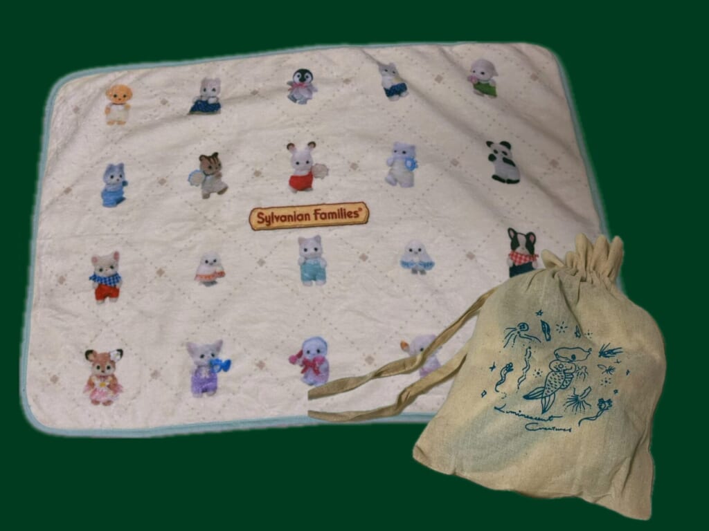 私はシルバニアファミリーのポップアップストアノベルティ(非売品)のブランケットをシンガーソングライター青葉市子さんのグッズである20cm×27cmサイズの巾着にまとめています!
