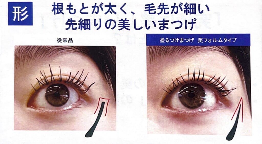 上の写真を見ていただくと、マスカラに繊維がなくツヤっとしているのが分かると思います!このジェルが毛先に向かって細くなる理想的な美フォルムを作ってくれます!