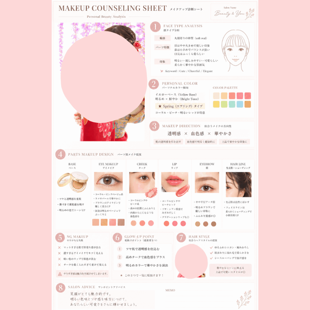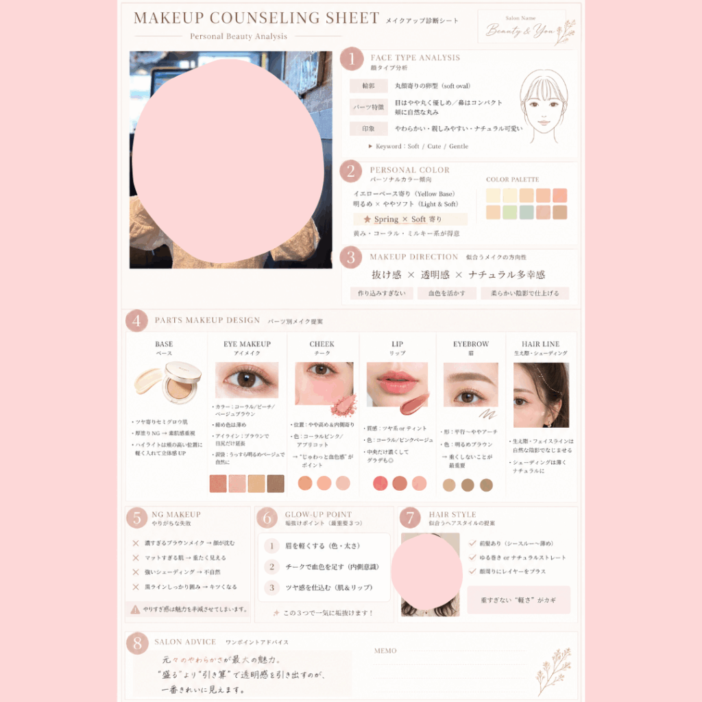 以下の情報をもとに、「美容サロンのカウンセリングシート風」のメイクアップ診断を作成してください。【目的】