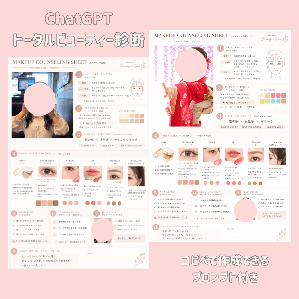 自分の写真とプロンプトを入力するだけで、まるでプロのカルテのような診断結果がシートとして出てくるのが特徴。SNSで「精度が高すぎる」「似合うメイクがわかった」と話題になっています。