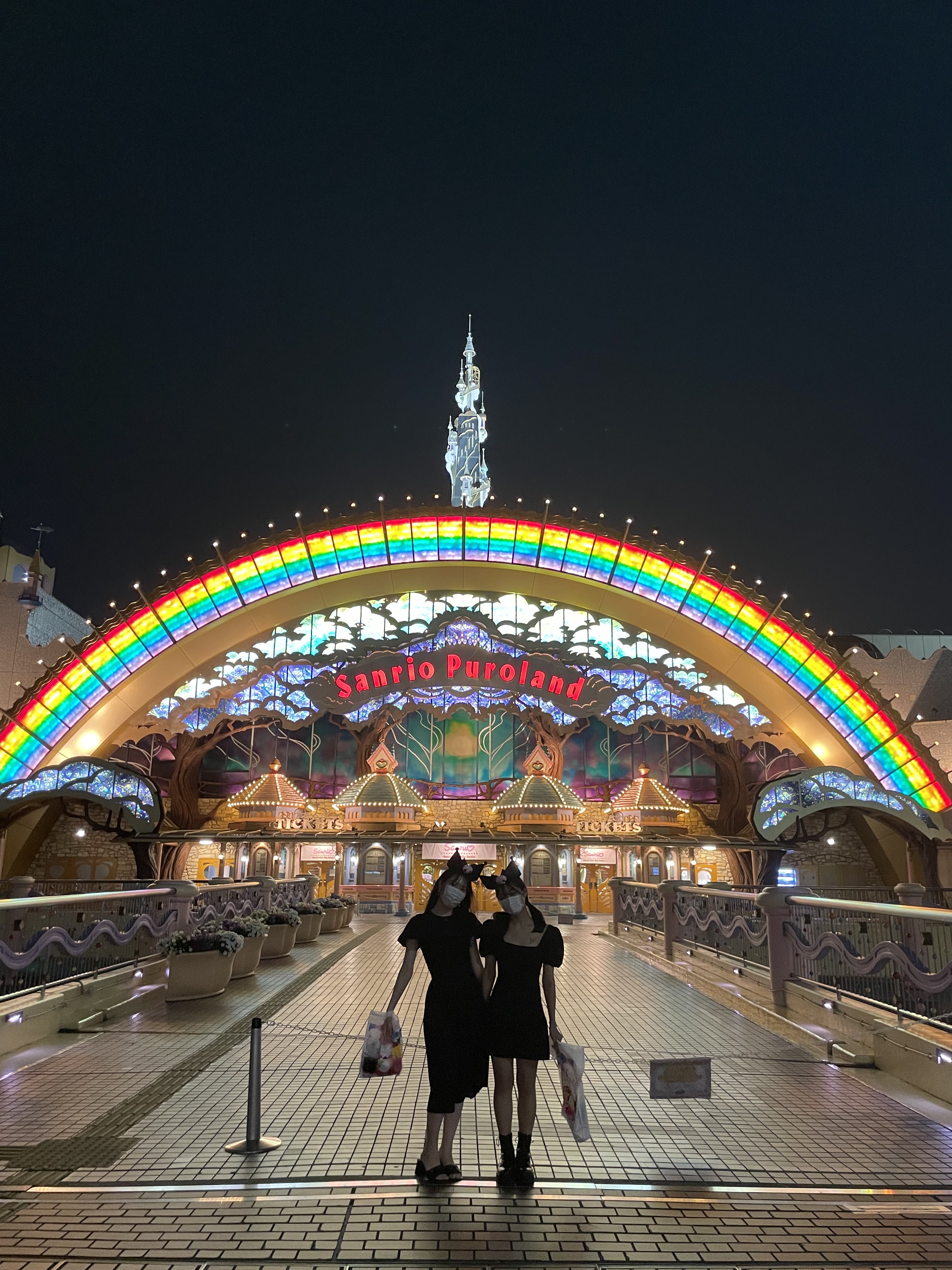 閉館後はライトアップされたピューロランド前で記念写真♡夜に撮るとキラキラしていて可愛さが一気に増します!