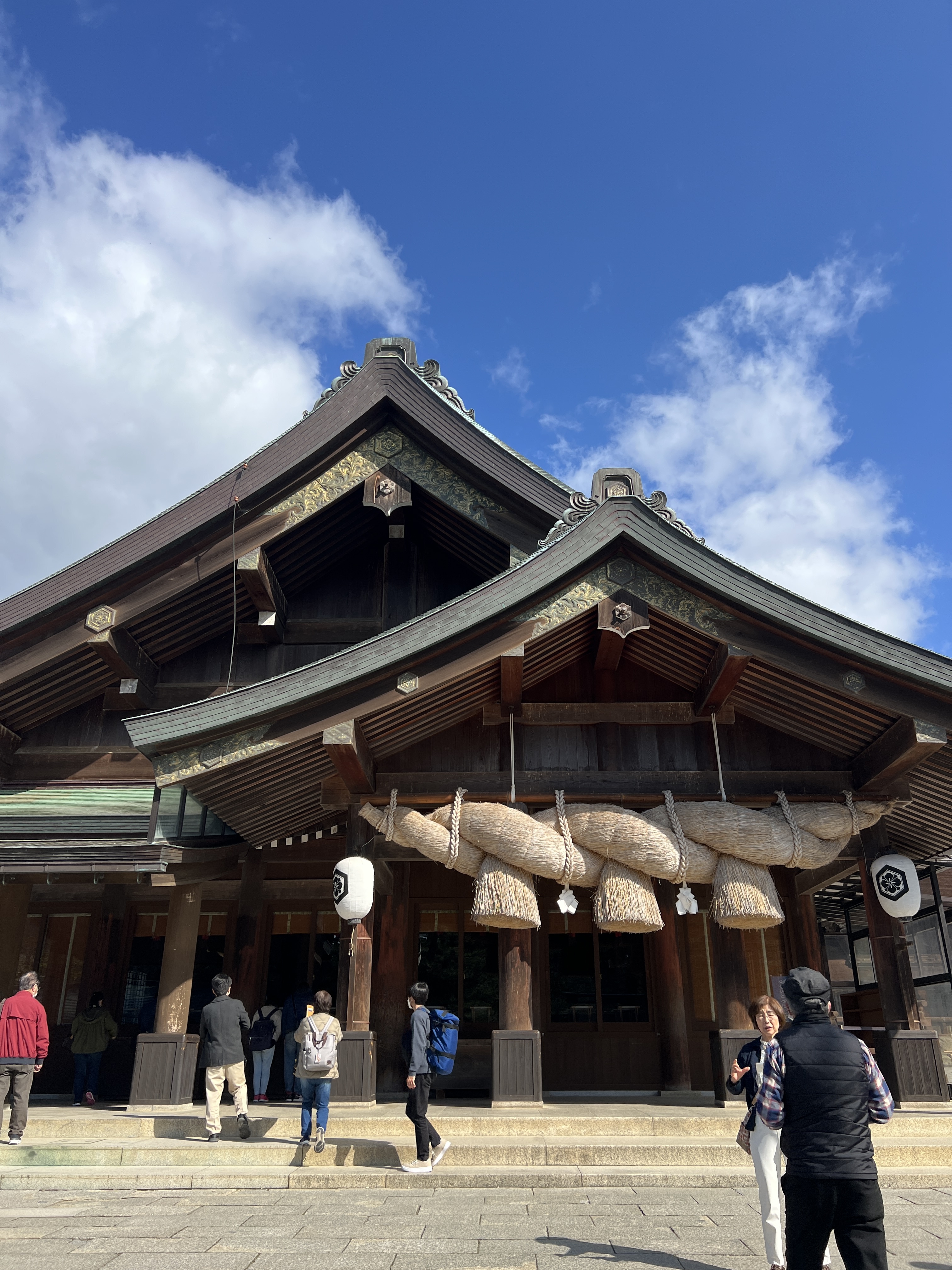 出雲大社のアイコンとしても知られる大きなしめ縄。迫力があって、境内に響き渡る太鼓や笛の音色が神秘的でした!