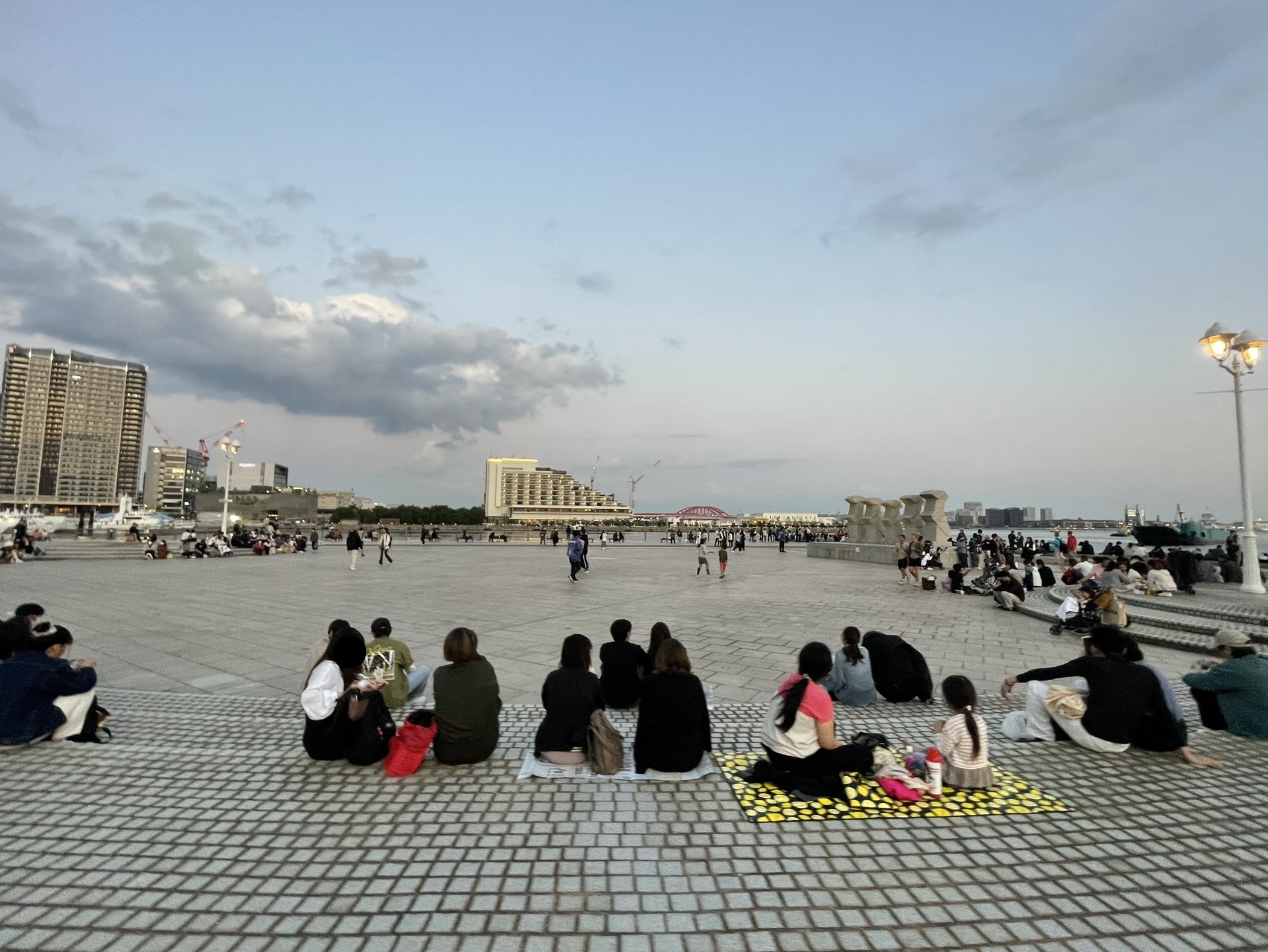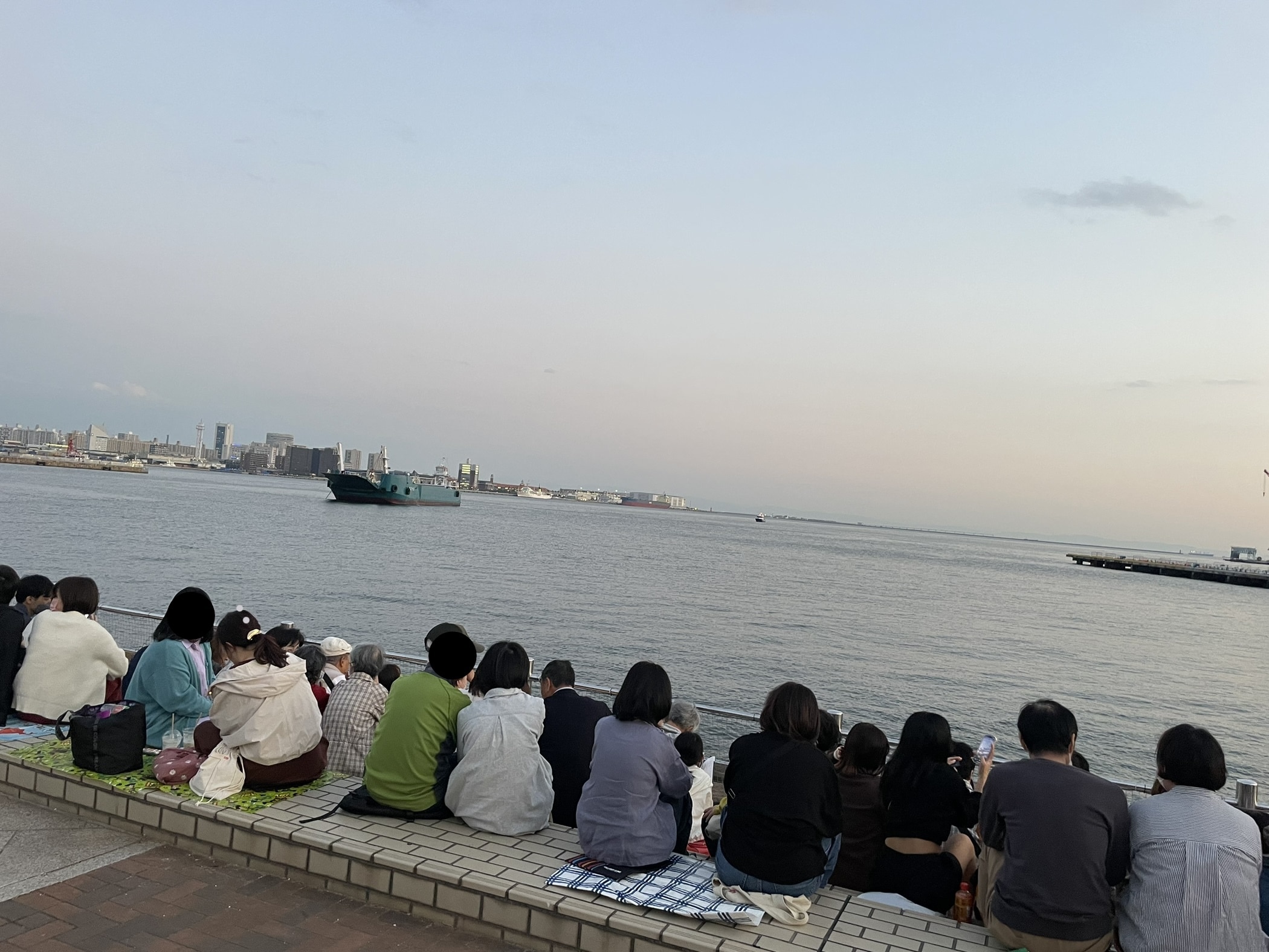 私たちは開始1時間前の17:30頃に観覧エリアに到着しましたが、すでに海に面した階段やベンチなど、見やすい場所はほぼ埋まってしまっていました。