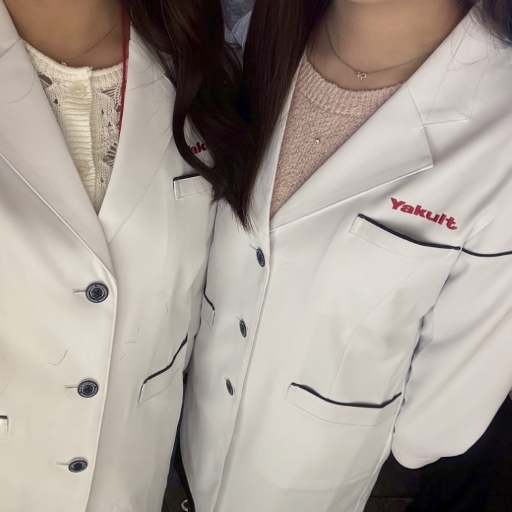 ヤクルトのロゴが入った白衣を着ることがてきる点がおすすめポイント! 白衣を着た後は菌の研究をします。