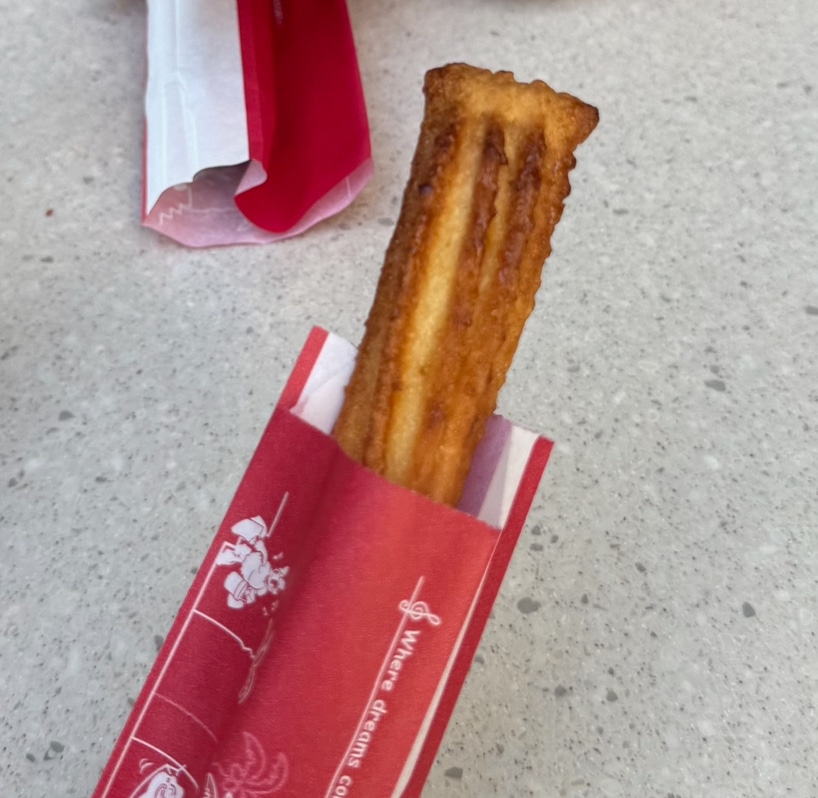 まず最初にご紹介するのは「ひんやりクールチュロス(クリームブリュレ風)」です!!パークに行くとよくいろんな味のチュロスを食べるのですが、冷たいチュロスは初めてで、食べた瞬間に冷たいクリームが口の中に広がりとても美味しかったです!このチュロスはベイサイド・テイクアウトで販売しています!期間限定なのでもしディズニーに行く機会があればぜひ食べてみてください!!