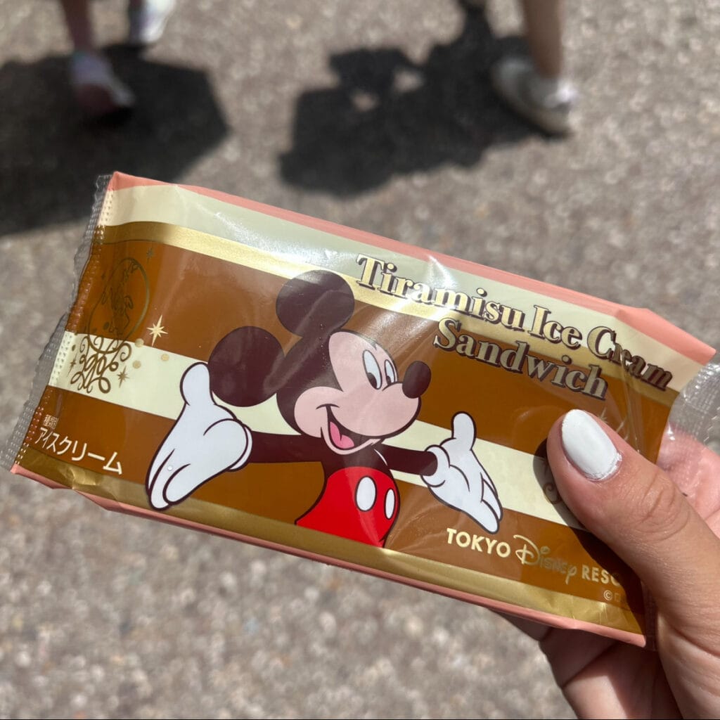 次にご紹介するのは「ティラミス・クッキーサンドアイス」です!!クッキー生地にミッキーの絵柄がついていて見た目もとても可愛く、アイスとクッキー生地のバランスも最高なアイスです!アイスはパーク内の至る所で販売されており、種類もいくつかあります!