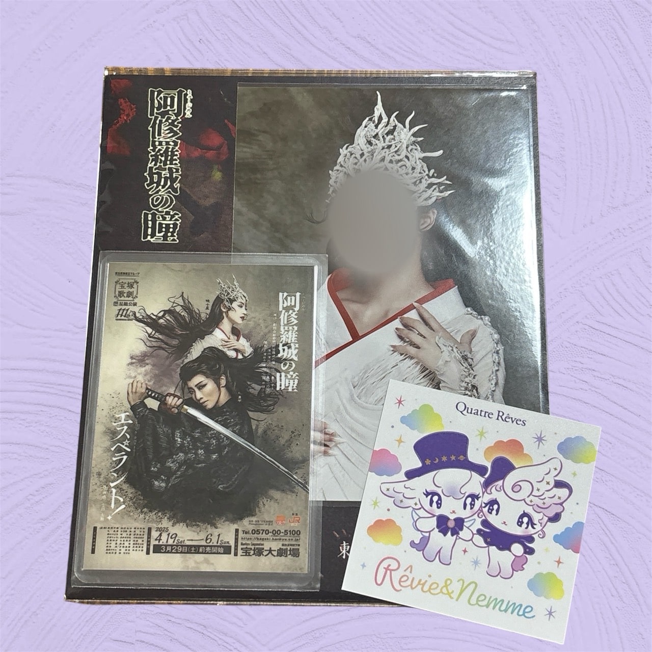 そしてその近くのショップ「キャトルレーヴ」で、コレクションカードと暁千星さんのスチールのセットを購入しました。東京宝塚劇場限定のラッピングでいつも販売されていてついつい買ってしまいます。キャトルレーヴの新キャラクター・ネムちゃんと、レヴィちゃんの可愛いステッカーをおまけでいただきました✨