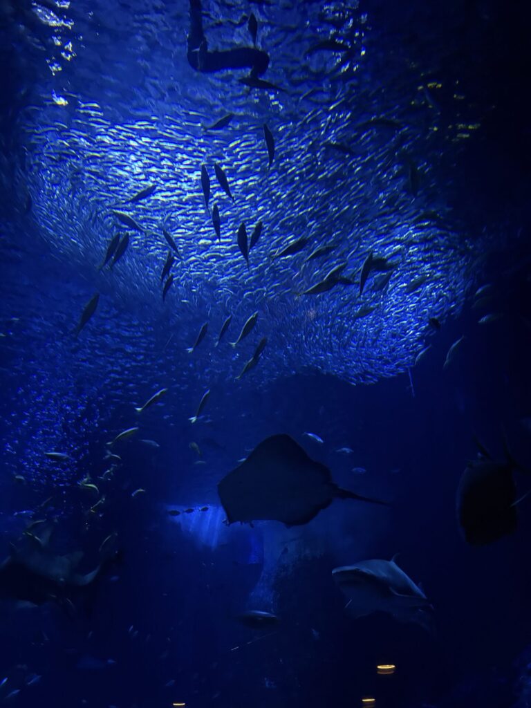 18:00を過ぎると照明が夜仕様に変化し、賑やかな昼とは一味違う静かで落ち着いた雰囲気に。特に1〜2Fにある大水槽は圧巻の景色が広がっており必見です。
