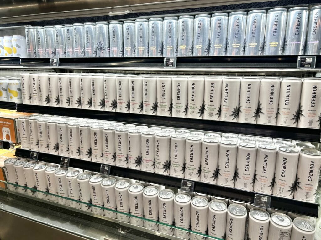 写真を見ていただくと分かる通り、全商品が隙間なく綺麗に並べられています。商品一つずつにEREWHONのロゴが入っているのも特徴的で、カラフルなドリンクや…
