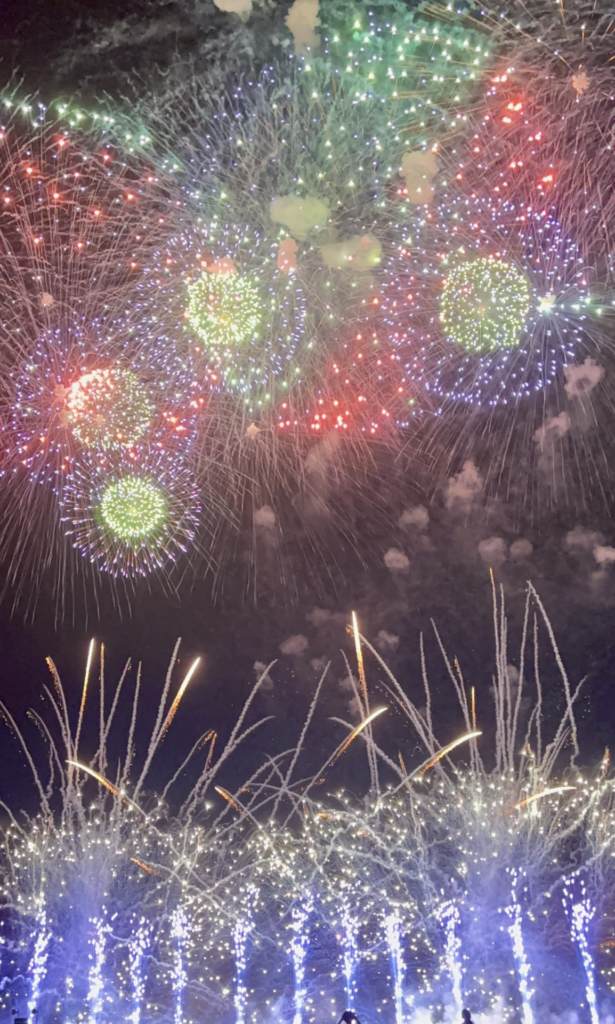 普通のスマホで撮影しただけですが、とっても綺麗です。つまり、実物はもっと綺麗です。こんなに美しい光景が長時間視界いっぱいに広がっているなんて最高じゃないですか。県民はもちろん、近隣の県からでも行く価値があります。実際、私はこの日帰省初日だったため、長時間電車に揺られた後見てきました。ちなみに、花火は3部構成となっているため、長さもちょうどよく満足感があります。個人的に、ヒット曲「はいよろこんで」のダンスの振り付けのように花火があがっている時間が少し面白かったです。ちょっとだけシュールでした。