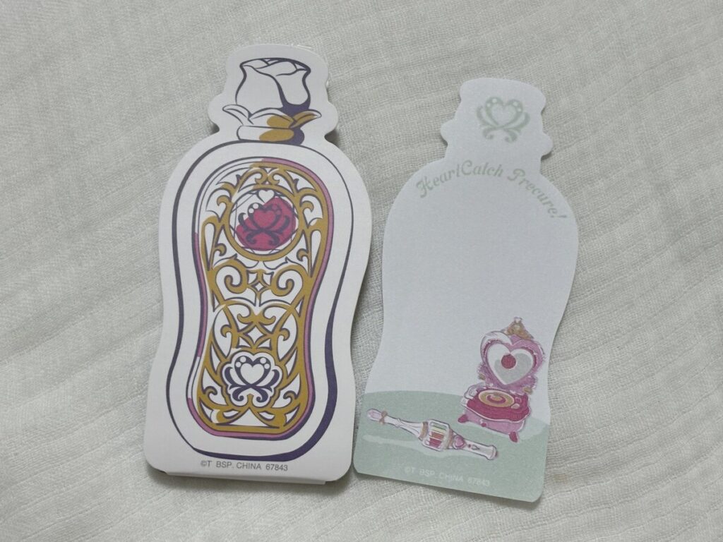 『ハートキャッチプリキュア!』の変身アイテム「ココロパフューム」の形のメモ帳。メモ用紙には「フラワータクト」「ハートキャッチミラージュ」が描かれています。同世代にちょっとしたメッセージを書いて渡せば懐かしさに盛り上がれそうです。