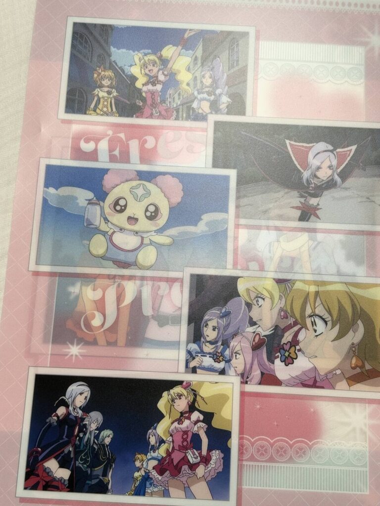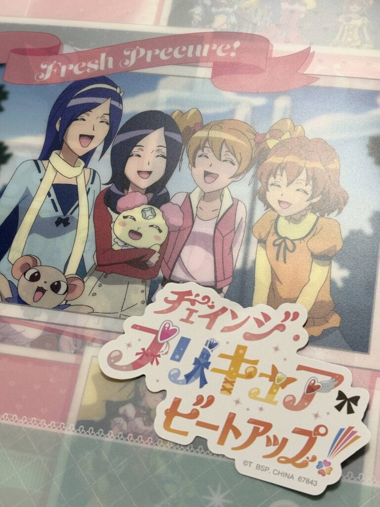 クリアファイルには『フレッシュプリキュア!』の名場面が両面に詰まっています。さらにステッカーには変身の掛け声が描かれています。こちらのステッカーはスマホケースの裏側に入るサイズ感でした。