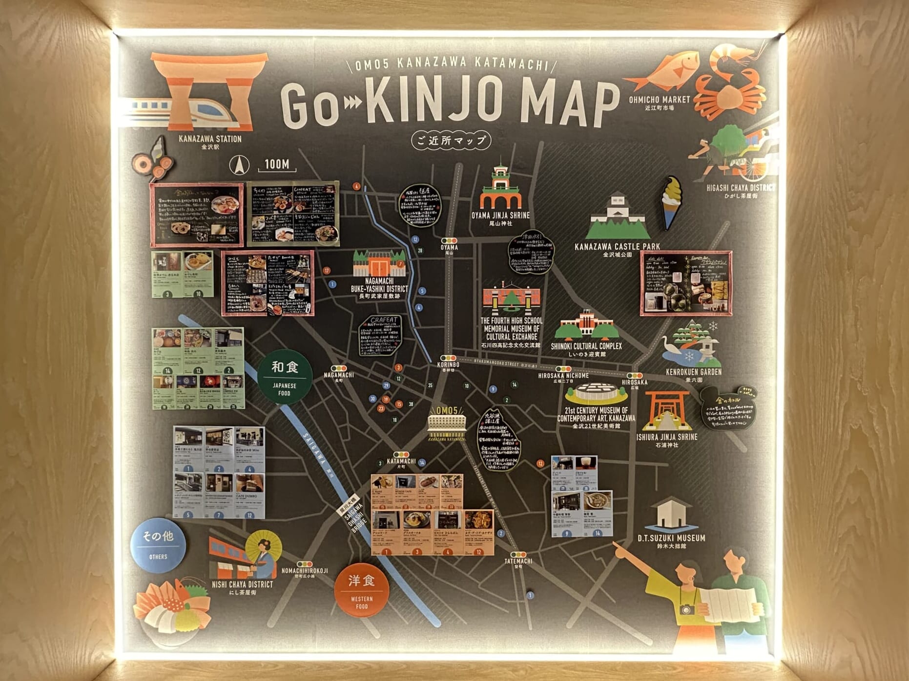ホテル内にあるGo-KINJOマップも街歩きの参考に! 金沢を知り尽くしたOMOホテルスタッフ(OMOレンジャー)さんが厳選した観光スポットをまとめた金沢最強ガイドマップ!これを見れば、行きたい場所がすぐに見つかります!