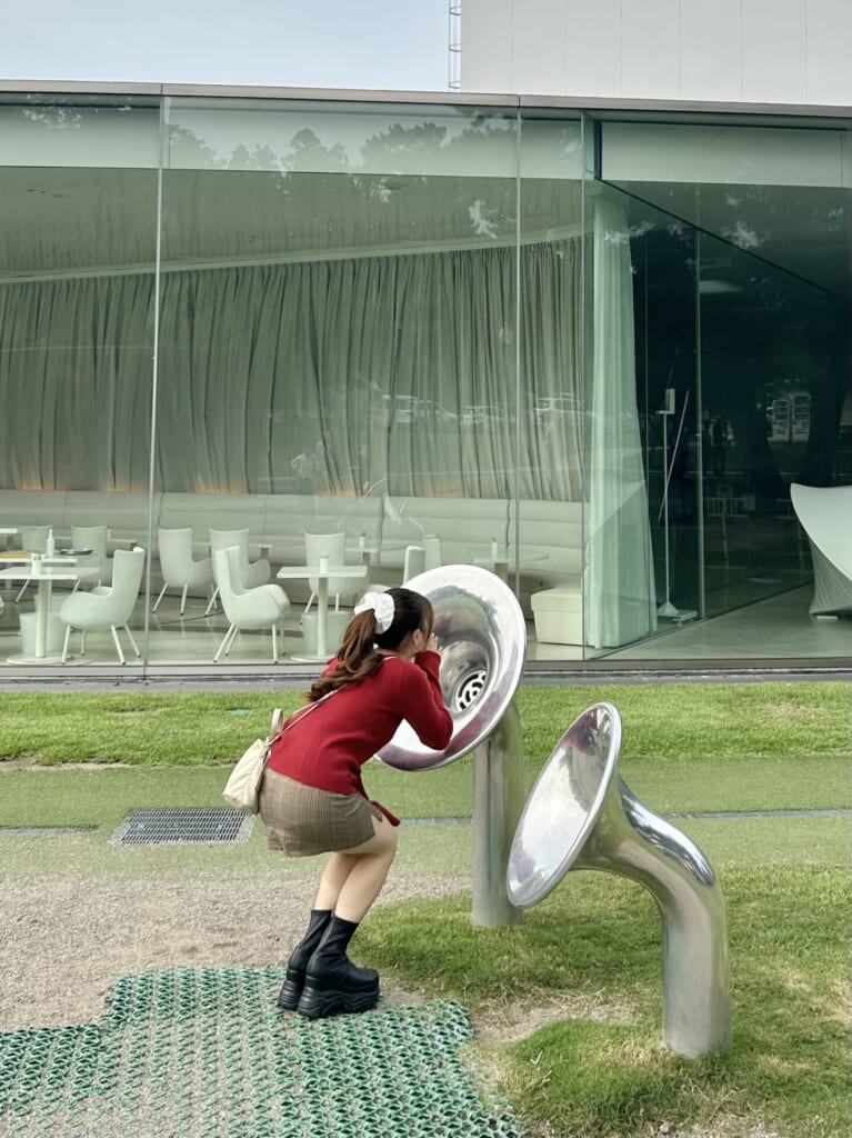 美術館を取り囲む芝生広場に設置されているラッパはフロリアン・クラールの「アリーナのためのクランクフェルト・ナンバー3」という作品です🎺この美術館外に12個あるラッパたちは実は、地中に通る管でつながっているそうです! ラッパに向かって声をかけると、別のラッパから声が聞こえてくるという仕組み。