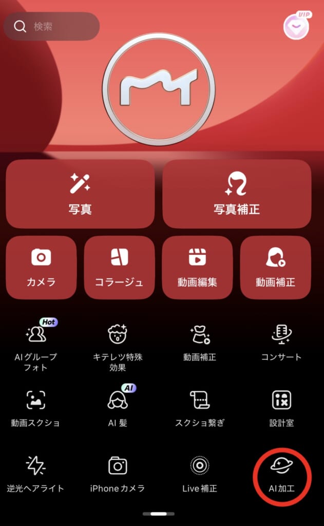 まずMeituのアプリを開き、最初の画面に出てくる「AI加工」欄をタップします。