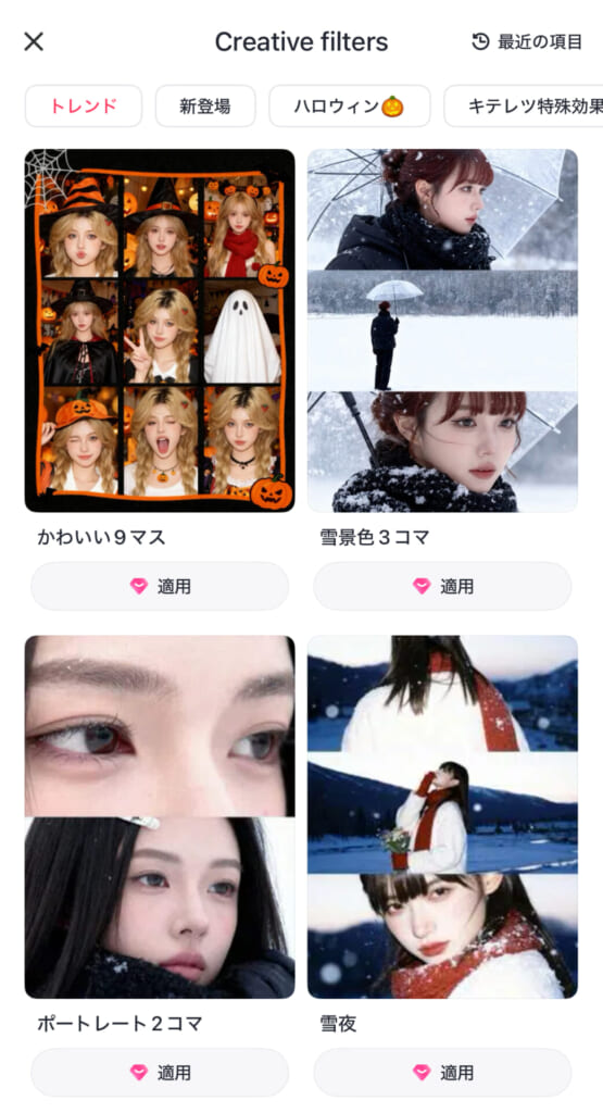 こちらをタップすると、以下の画像のようなページが表示されるので、そこから自分がしたい加工を選びます!
