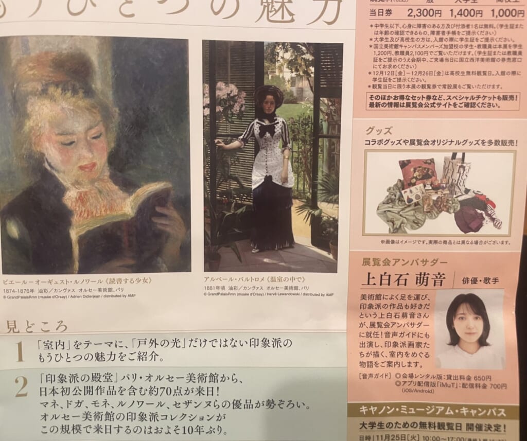 私は、印象派の絵画の光の表し方がとても綺麗で好きなので、今回観に行こうと決めました!