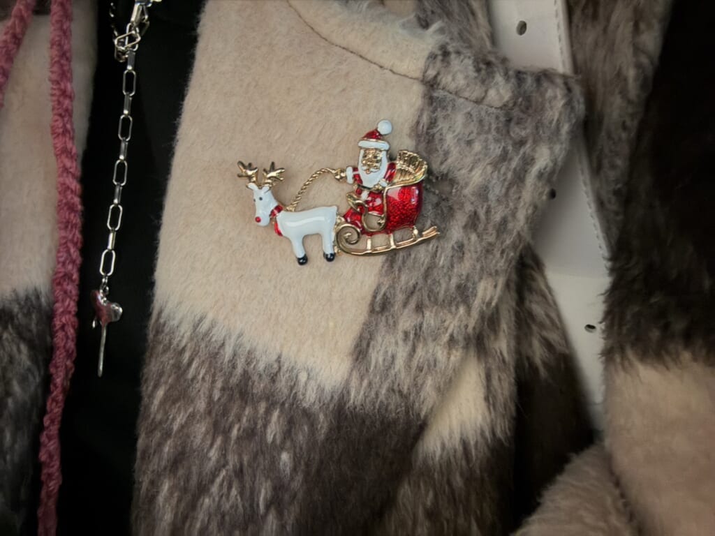 ブローチ集めが趣味で、クリスマスのブローチが欲しかったので、見つけた瞬間買うことを決意しました!クリスマスツリーのブローチとの2つで悩んで悩んで、結果サンタさんとトナカイの方を購入。