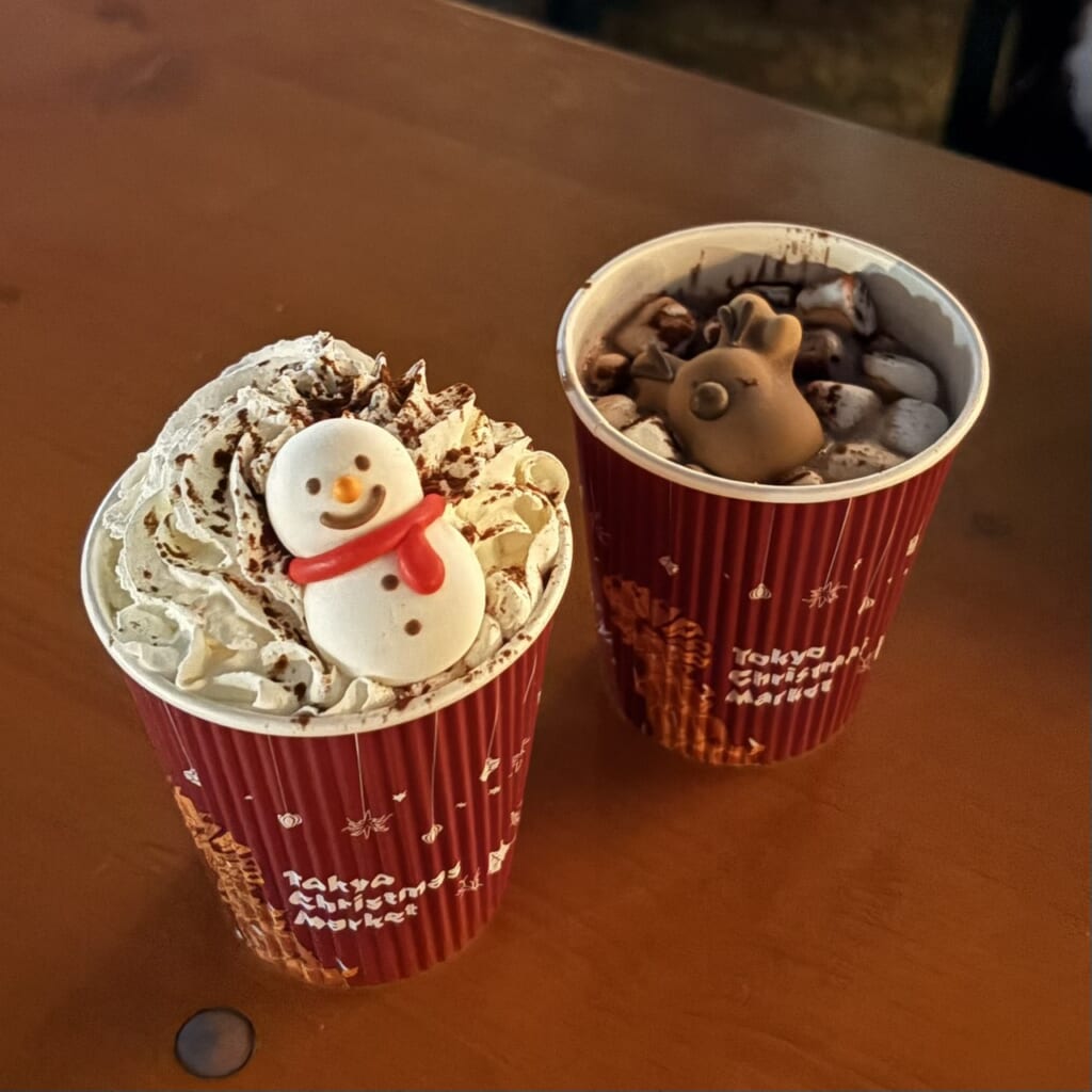 私は入り口近くにある㉚SantaHouseというお店でサンタさんのホイップココア(サンタさんのマシュマロが売り切れてしまっていて、スノーマンになっていました)と、トナカイさんのマシュマロココアを購入⛄