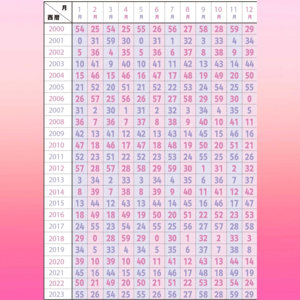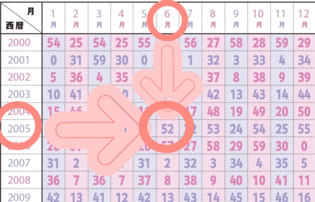 - STEP2 [STEP1]の数字に、自分の生まれた日の数字を足す。足した数字が61以上になった場合は、60を引く。