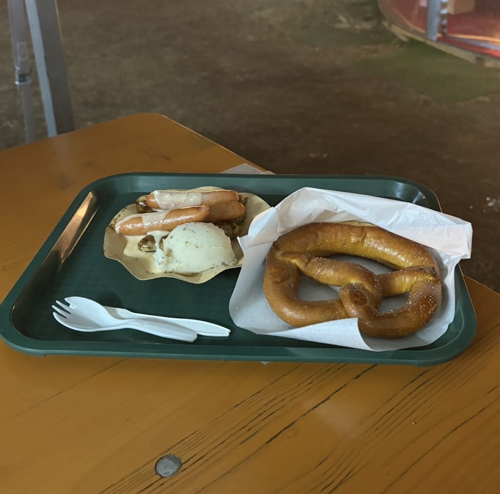 次に食べたのはプレッエルとソーセージです!この二つはクリスマスマーケットには欠かせないと思い、気がついたら食べていました!!バニラシュガー味のプレッエルは甘すぎず美味しかったです!ソーセージもチーズのついたものを購入したのですが、とても美味しかったです!