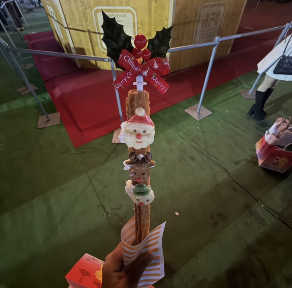 まず最初に食べたのは、トナカイやサンタさん、雪だるまがついたチュロスです!たくさんの人が歩きながらチュロスを手にしていて、その可愛さに思わず購入してしまいました!とても可愛かったです!販売しているお店は3店舗ほどありました!