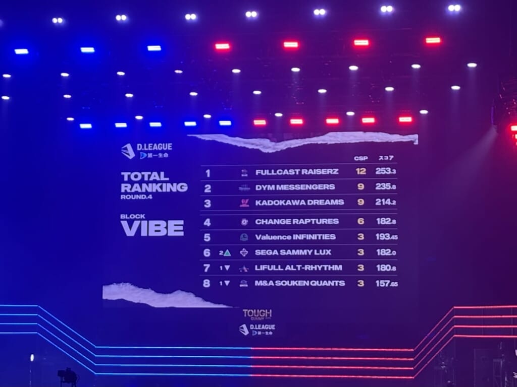 全Match終了後、全体のランキングはこのようになりました! FULLCAST RAISERZは1位を守り、初勝利を収めたSEGA SAMMY LUXは順位を2つ上げました!