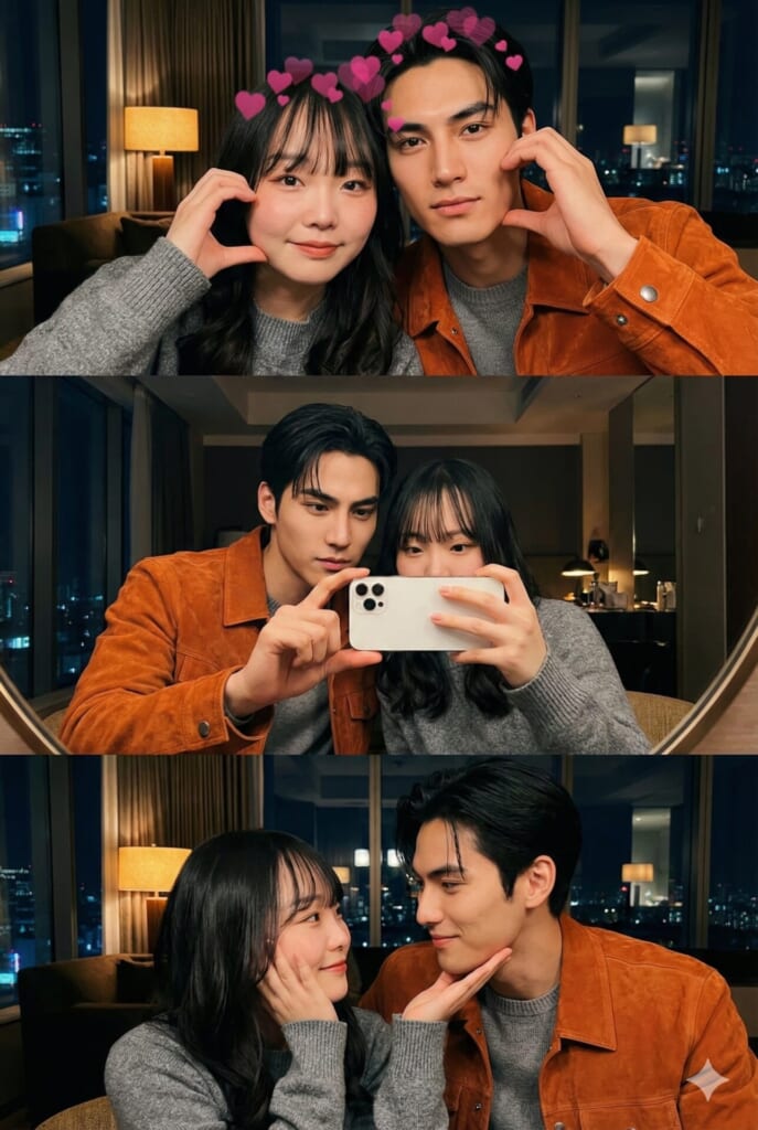 Panel 1 (Top): The two subjects, as defined by the reference images, are positioned close together, looking directly at the camera. Both are performing the popular “looda heart” (cheek heart) pose with their hands. The same pink heart filter effect seen above the heads. This heart filter is made visible on the heads of each of the two characters, and it’s made possible to see this filter according to the shape of each head
