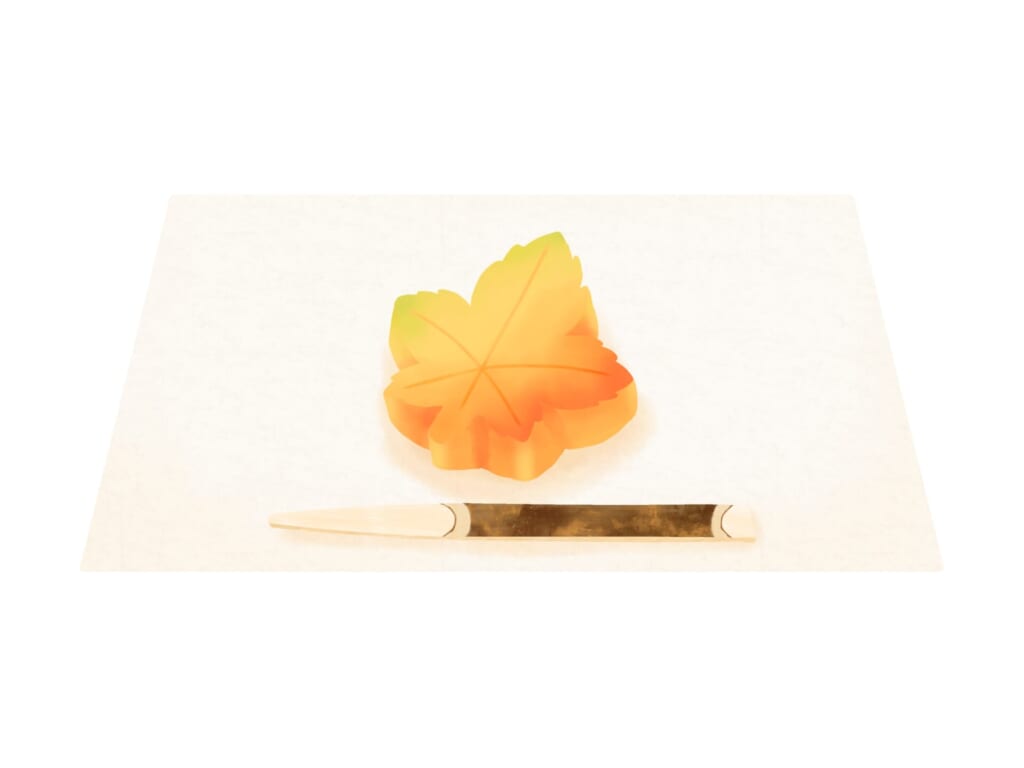 水分量の多い生菓子の中でも季節感を取り入れた上等なものを上生菓子と呼び、練り切りなども含まれます。鞠はこなしという生地で作られた「紅葉」を抹茶と共に味わいます。