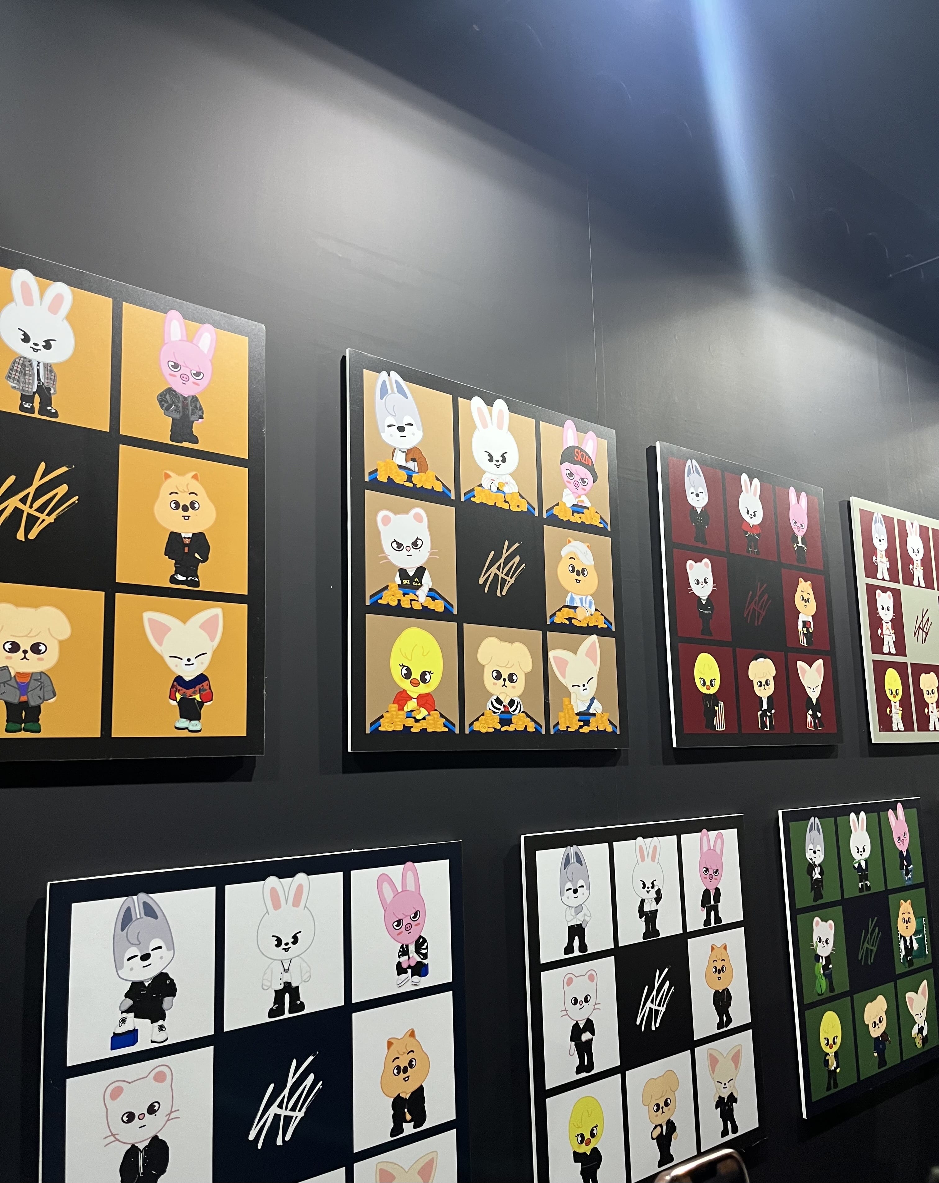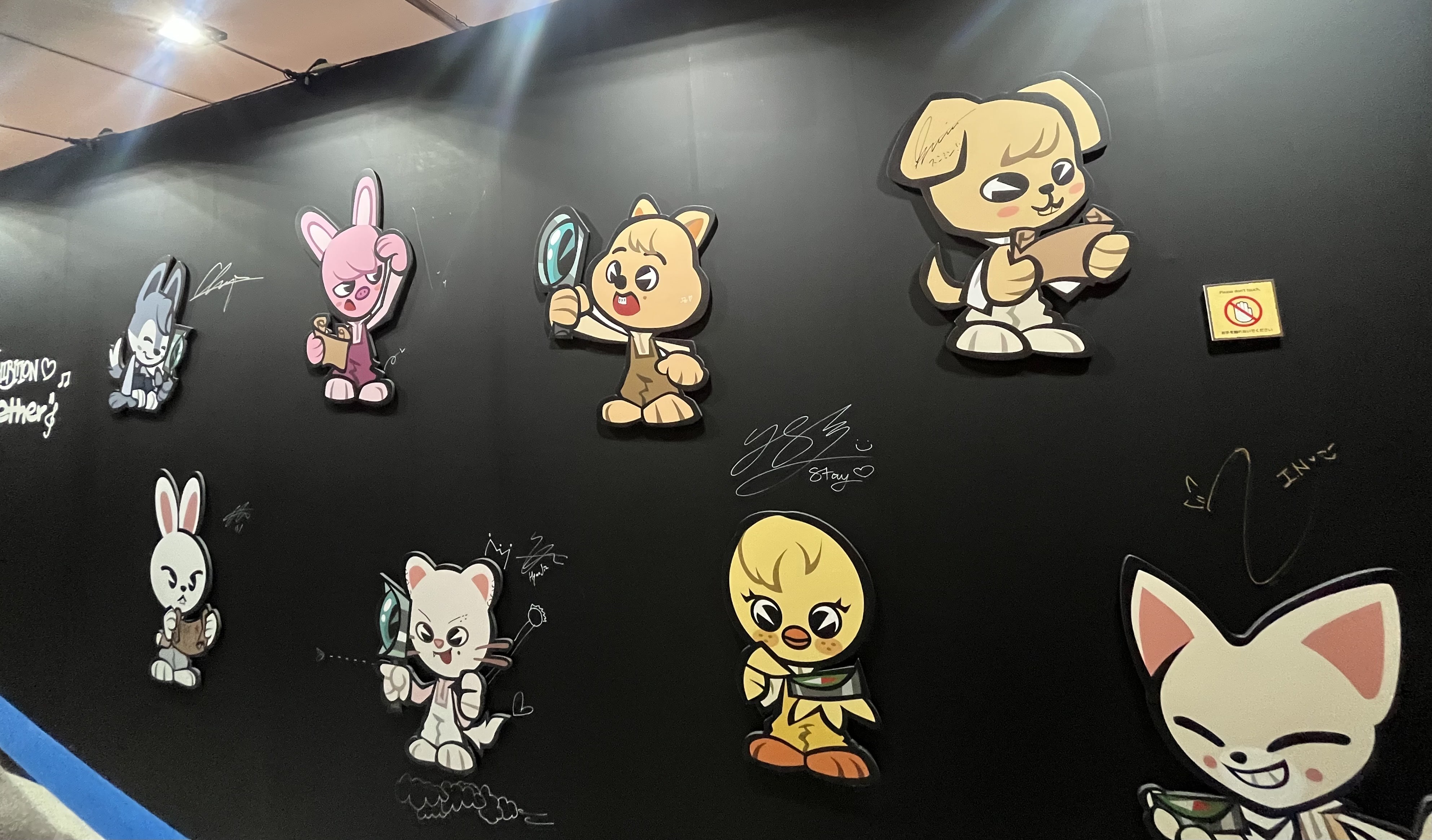 展覧会に入るとまず、メンバーの直筆サインボードとそれぞれの大きな個人写真、Stray Kidsのメンバーを動物に見立ててキャラクター化した「SKZOO」のボードを見ることができます!