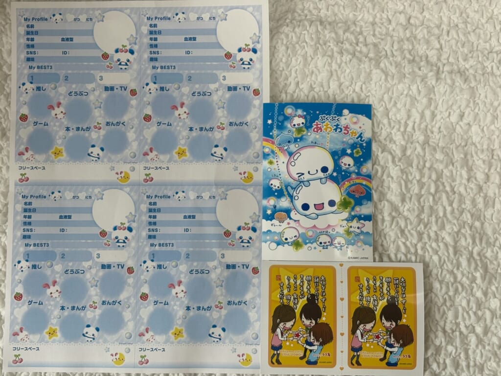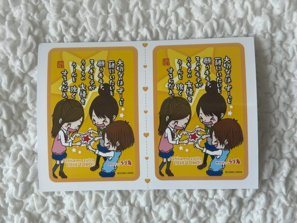 友情と青春が詰まったフレーズが印象的な『明日もずっとラブ友』からカード風のブロマイドが登場。同じ柄が2つ並んでいる仕様になっているので、自分の「ラブ友」と切って分け合えるんです!フレーズも沢山あって集めたくなります。