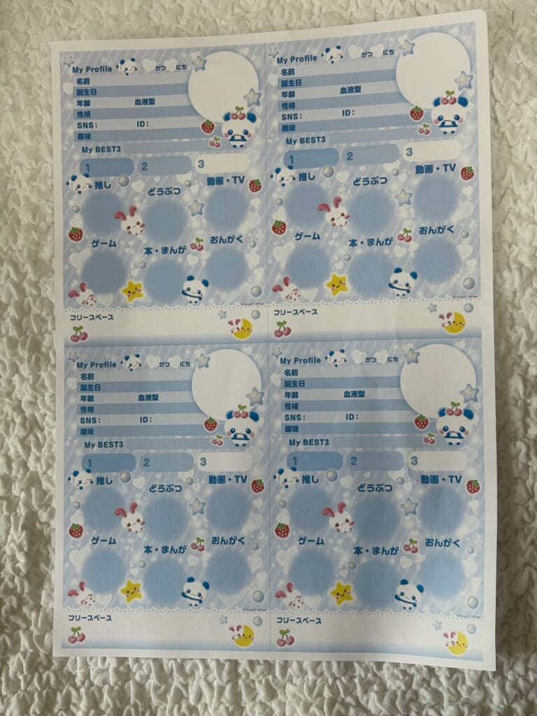 5種類の柄から選んで印刷できるこのシートは、A4サイズの紙に同じデザインのプロフィールシートが4つ入っています。コンビニで簡単にプロフ帳の紙がゲットできちゃうのがすごい…!今好きなものたちはもちろん、平成当時を振り返りながら書いてみるのもいいかもしれません。
