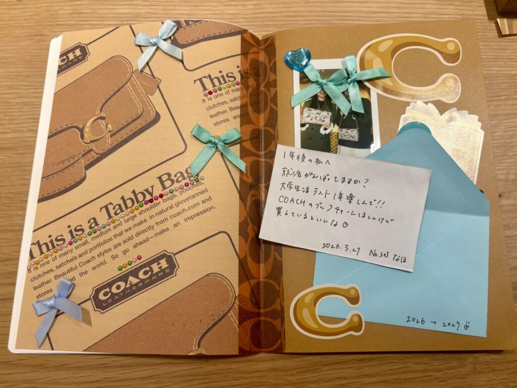 完成したものがこちらです! 好きな色のブルーのパーツをふんだんに使い、お気に入りのチェキを貼り付けました! 封筒パーツがあったので、1年後の自分宛てに手紙を書いてみたのもポイントです!