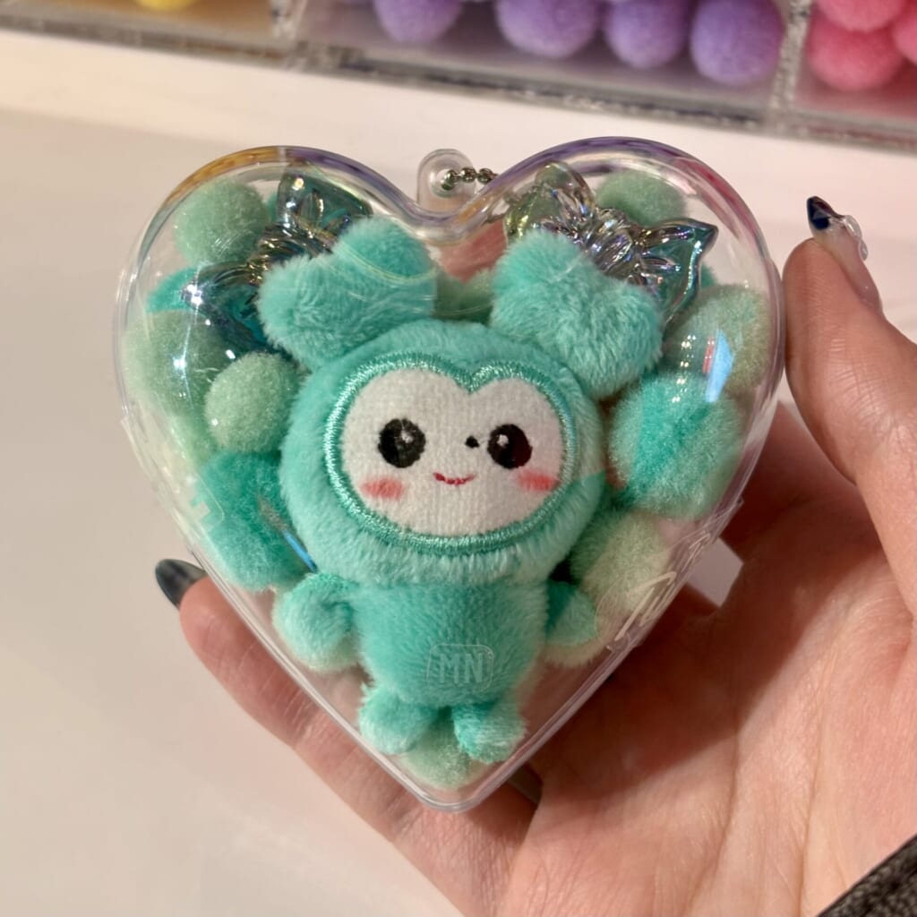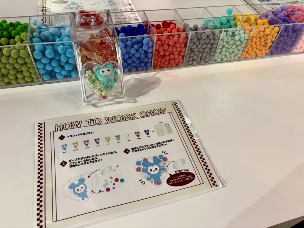 今回のポップアップストアの目玉はワークショップです! ハートケース付きのマスコットを、ビーズやボンボンのパーツ、ステッカーなどで可愛くデコレーションすることができます!