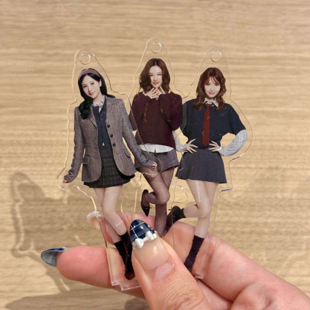 中でも1番気に入っているのが、ランダムミニアクリルチャームです! 今回の制服ビジュがとても好きなので、3つ買ってみたところ、MISAMOの3人が揃って激アツでした! ボールチェーンを通してアクキーとしても、スタンドに立ててアクスタとしても使えるのでおすすめです!