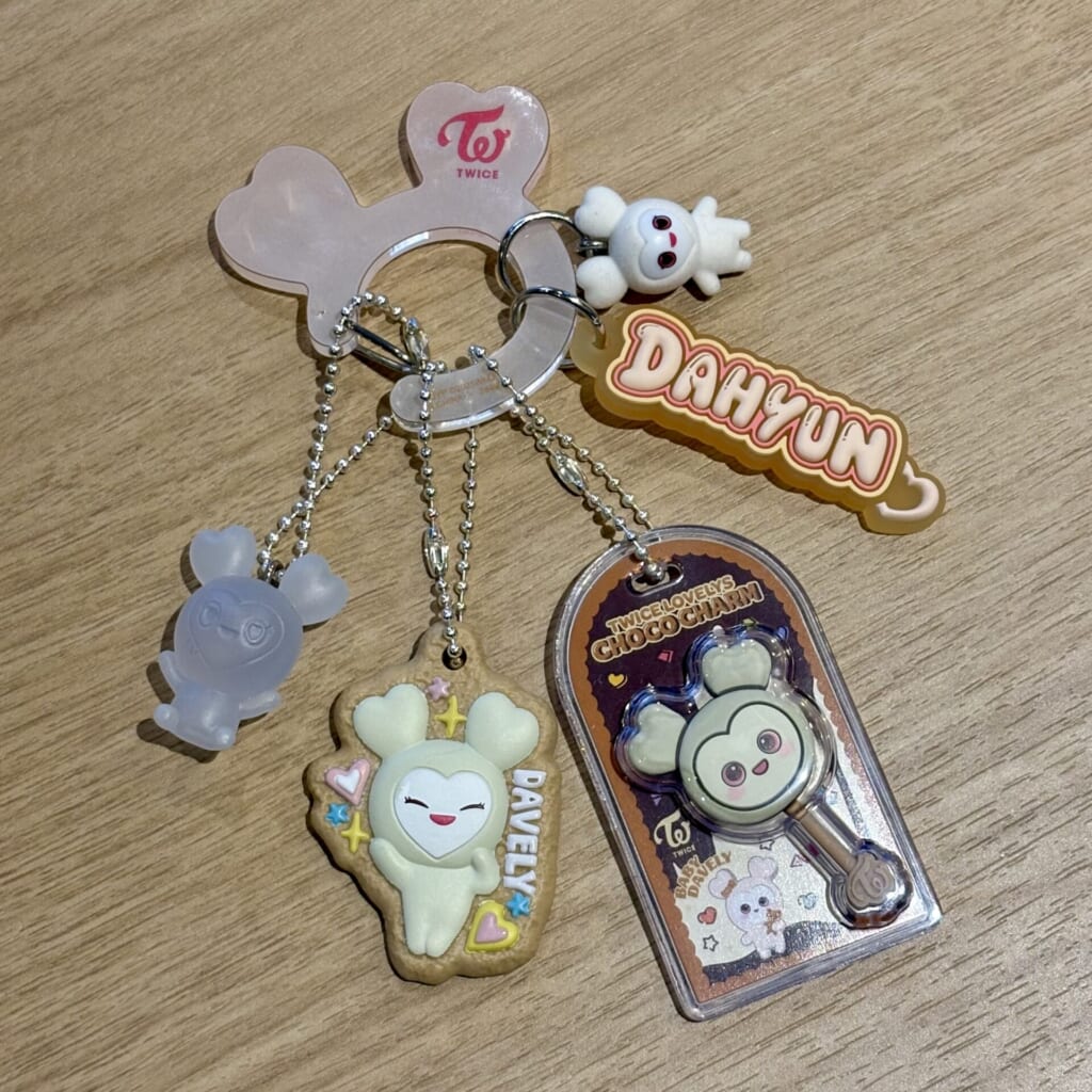 今回のガチャはこのままでももちろん可愛いですが、カラビナを活かして他のキーホルダーをじゃらじゃら付けるのがおすすめです! この写真では、TWICEのお菓子で手に入れたダブリーのキーホルダーを追加で3つほど付けてみました!