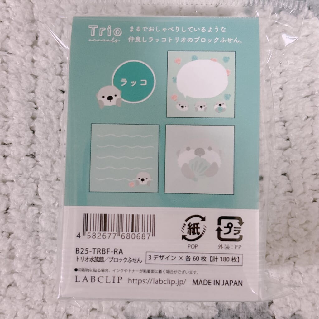 3つのデザインが各60枚付いているブロックふせんで、ラッコ柄を選びました! 他にもメンダコやクジラなど、種類がたくさんあってめちゃくちゃ迷いました🌀
