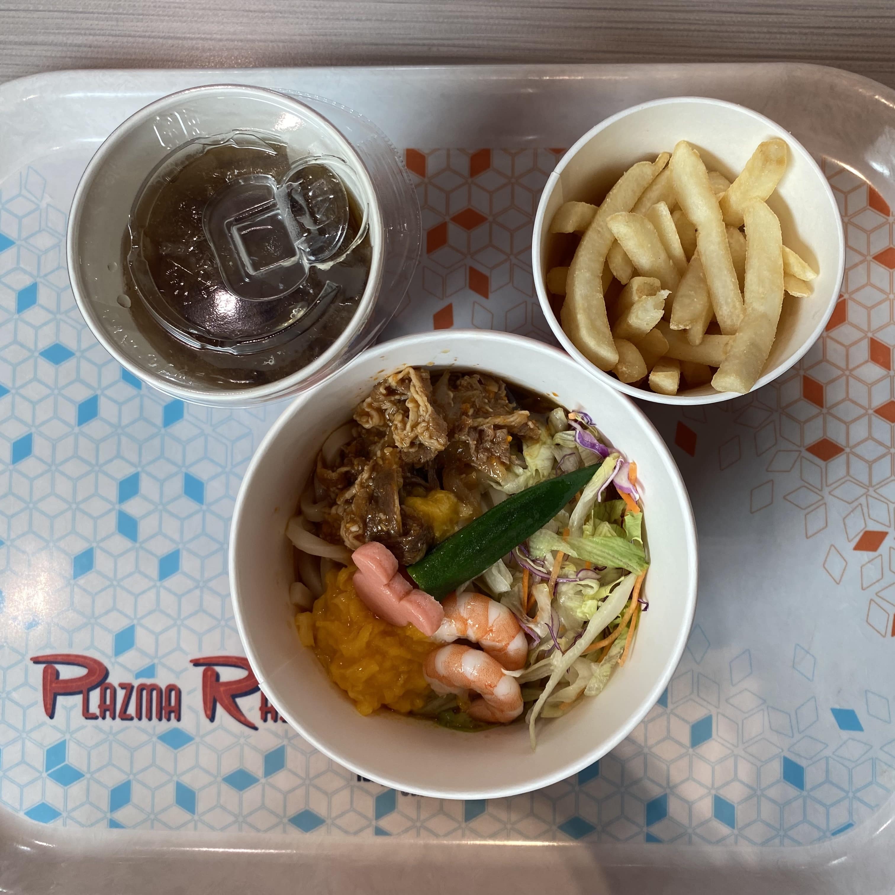 左の写真は、トゥモローランドの「プラズマ・レイズ・ダイナー」というお店で購入した「牛カルビとシュリンプと玉子の冷やしうどん」とポテトとドリンクのセットです!?