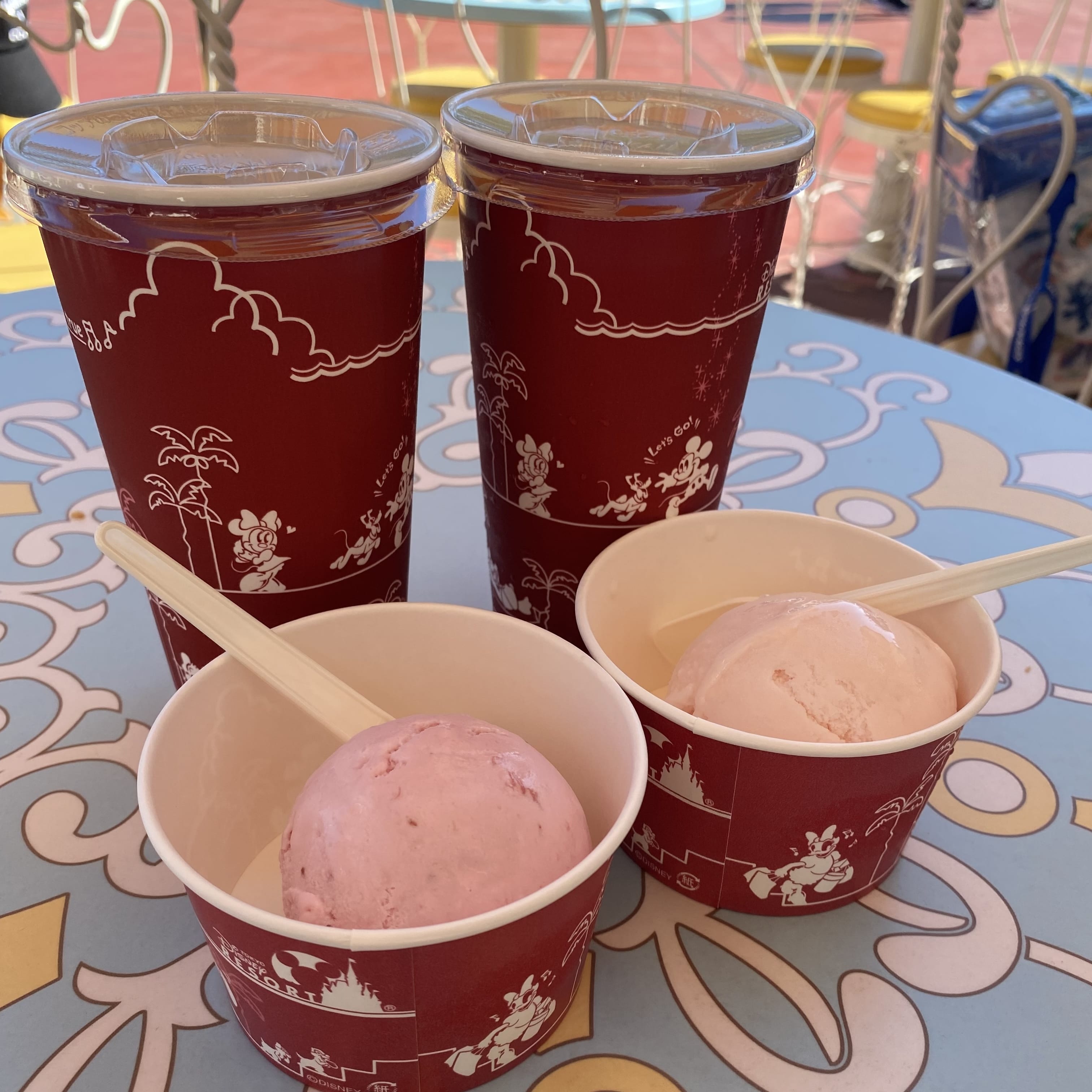 真ん中の写真は、ワールドバザールの「アイスクリームコーン」というお店で購入した、ストロベリーとピーチシャーベットのアイスクリームです!