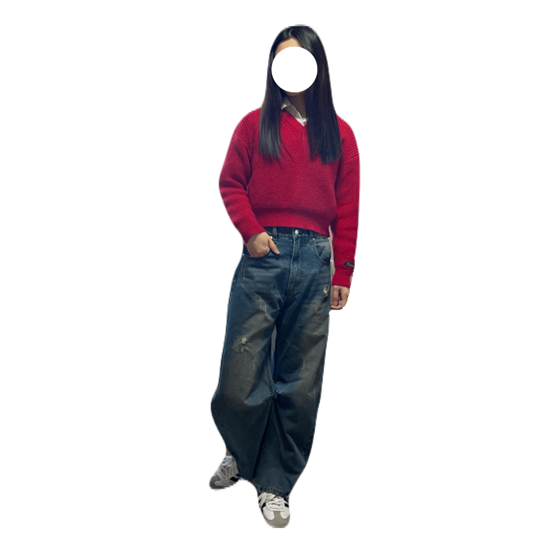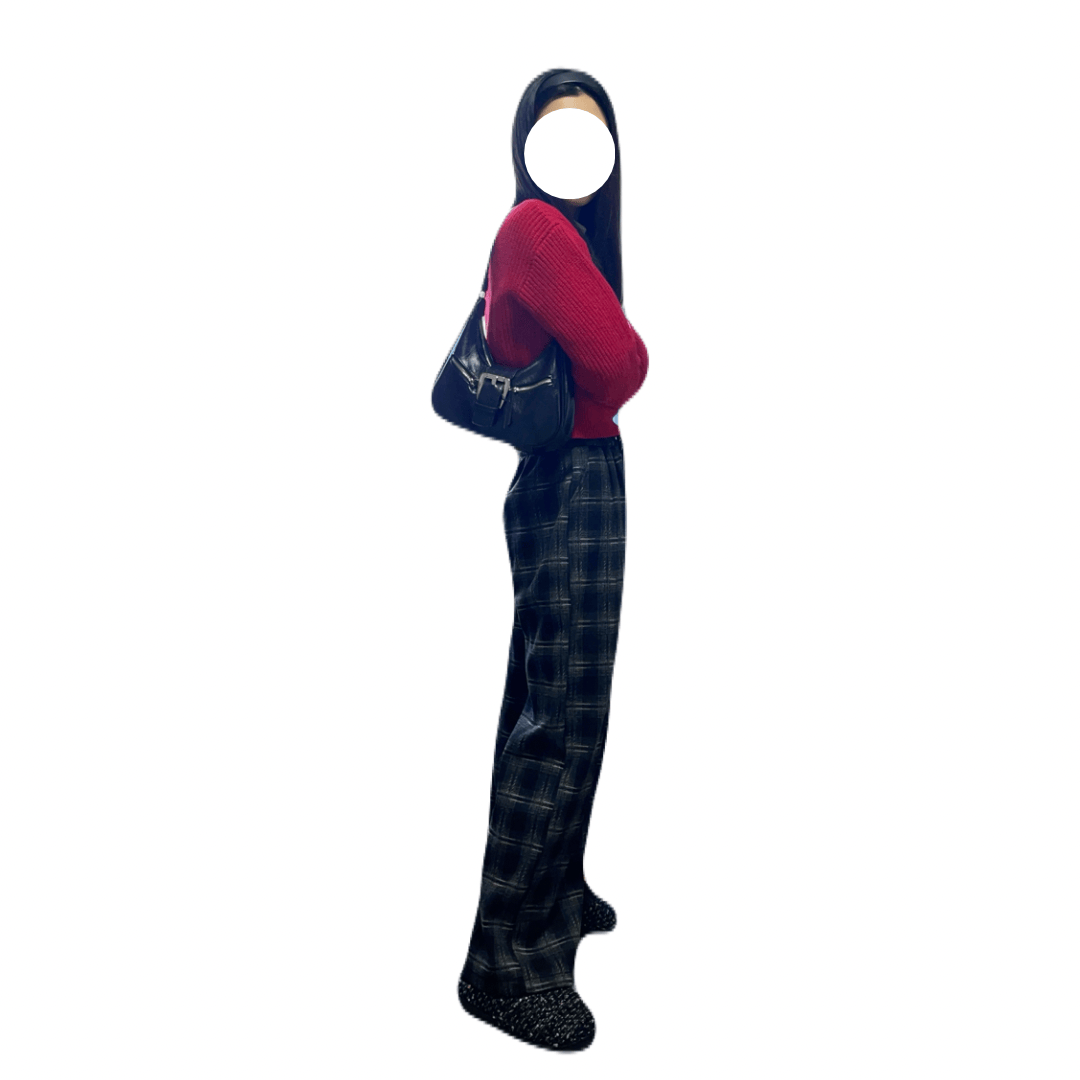 ニットの丈が短く、ピタッとしているシルエットでもあるため、パンツはゆったりしたデザインのアイテムを選びました。